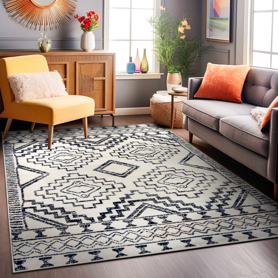 Transitional Bohemian Indoor Area Rug - CREAM 5'x7' - Black