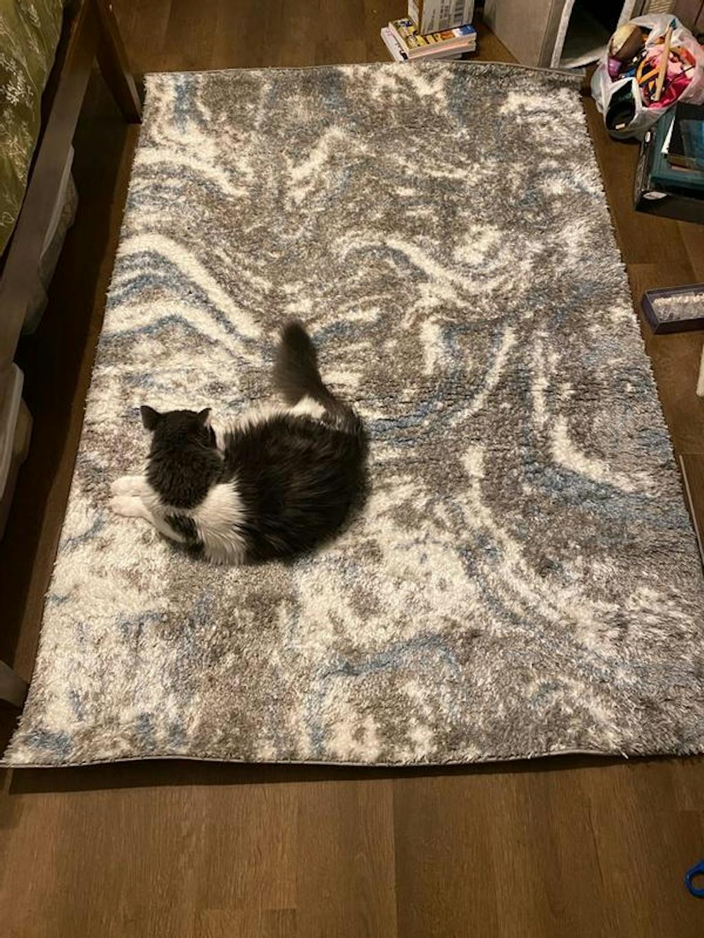 Modern, Bohemian style. Style your playful coastal-style rooms with this Abstract Marble shag rug featuring a cozy medium pile. The soft Abstract Marble pattern adds inviting texture that families love. This version comes in calming Blue. Its Abstract Marble design and medium pile provide a stylish yet cozy layer for living rooms, bedrooms, or play spaces. This rug offers a dimensional feel and adds a calming pop of color, making it a versatile choice for modern households. Crafted from 100% Polyester with a durable jute backing, it's kid and pet friendly, easy to clean, stain and fade resistant, and no shedding. Vacuum often, spot clean as needed, and rotate periodically for even wear.