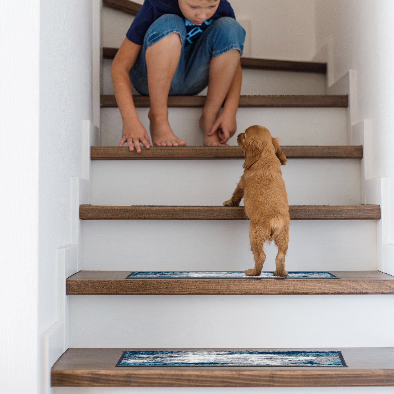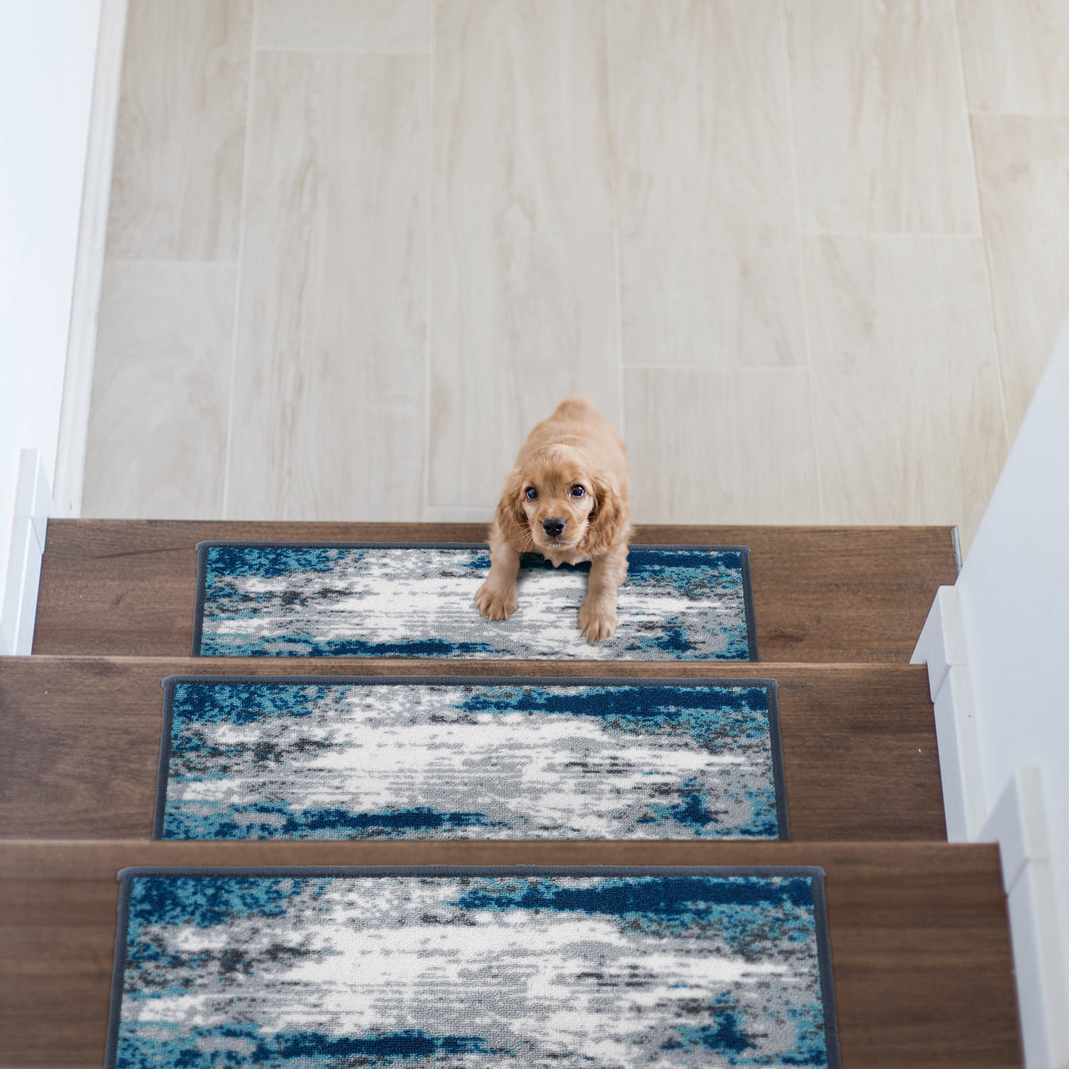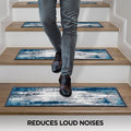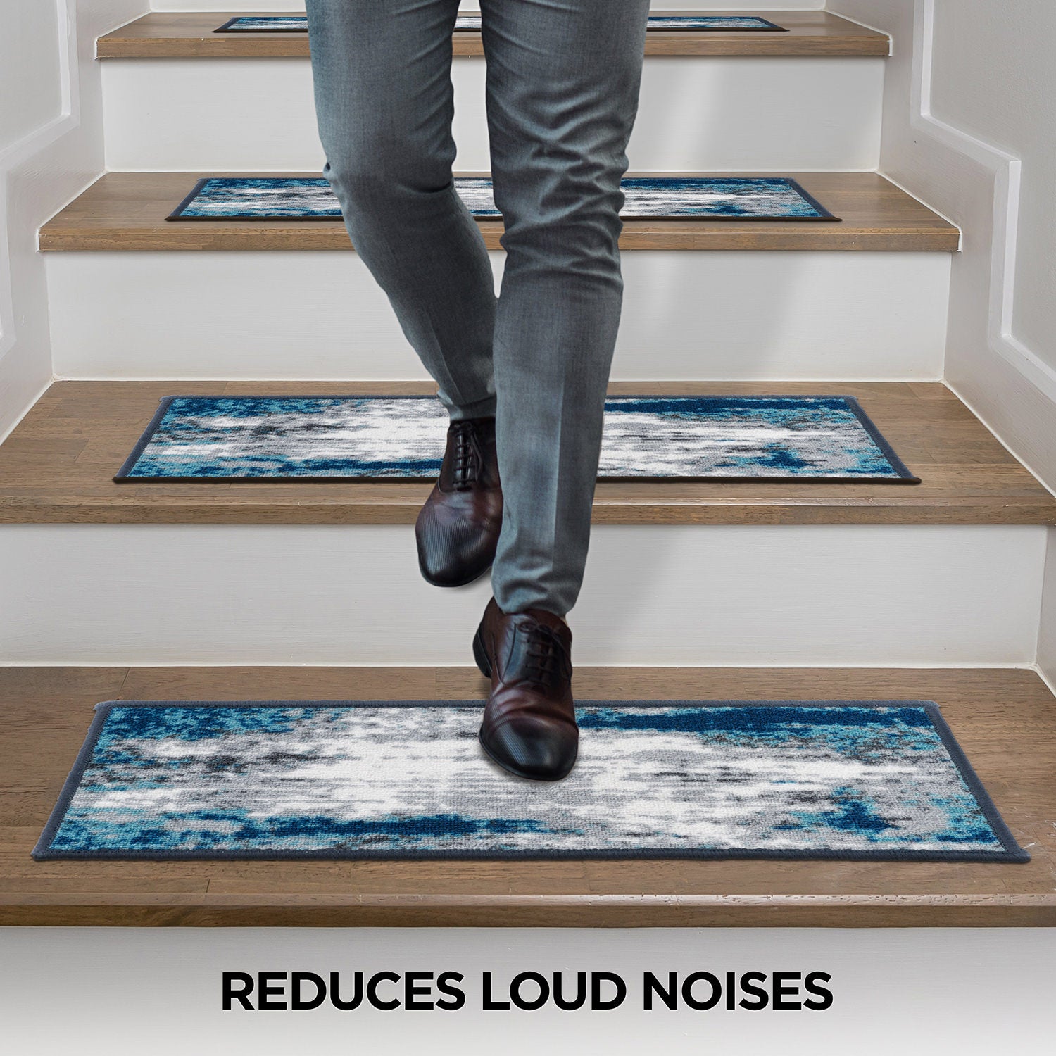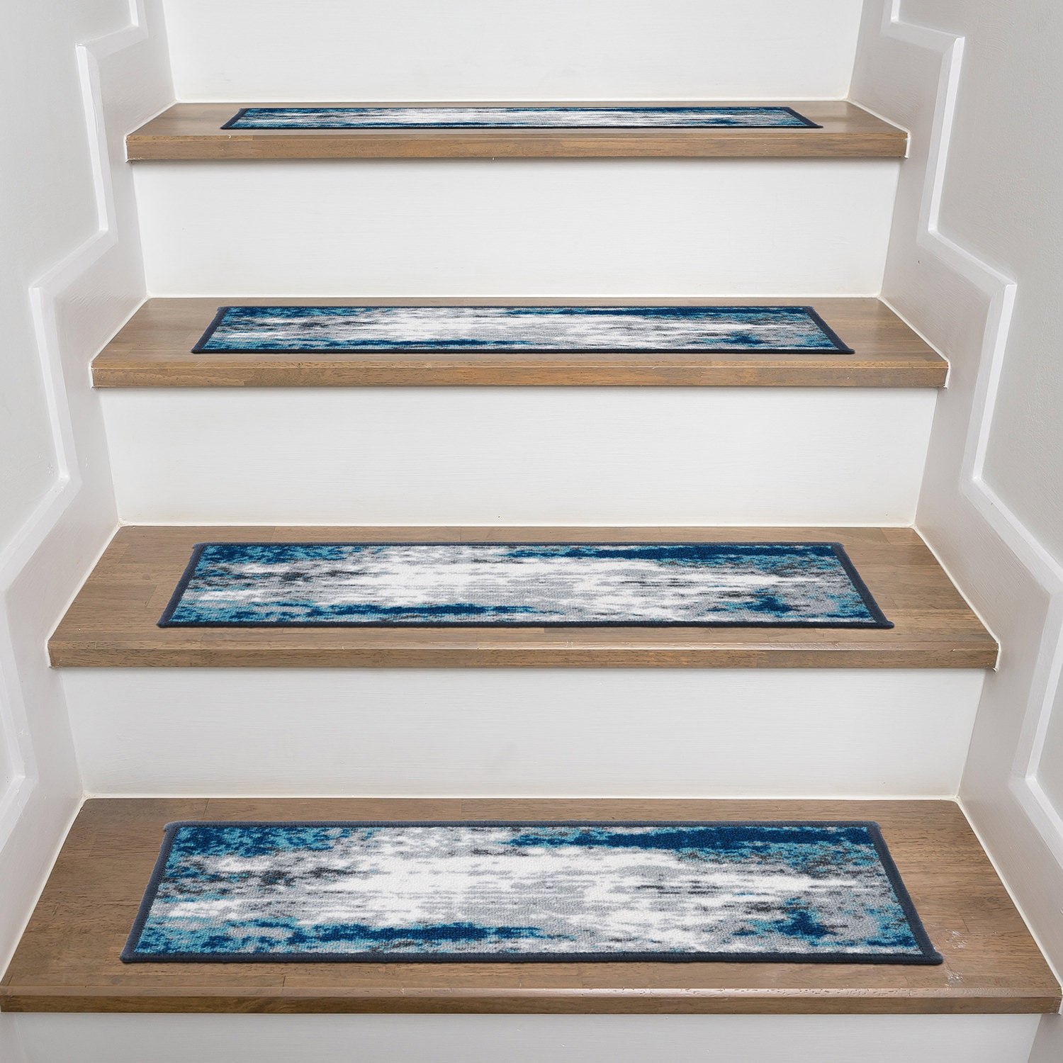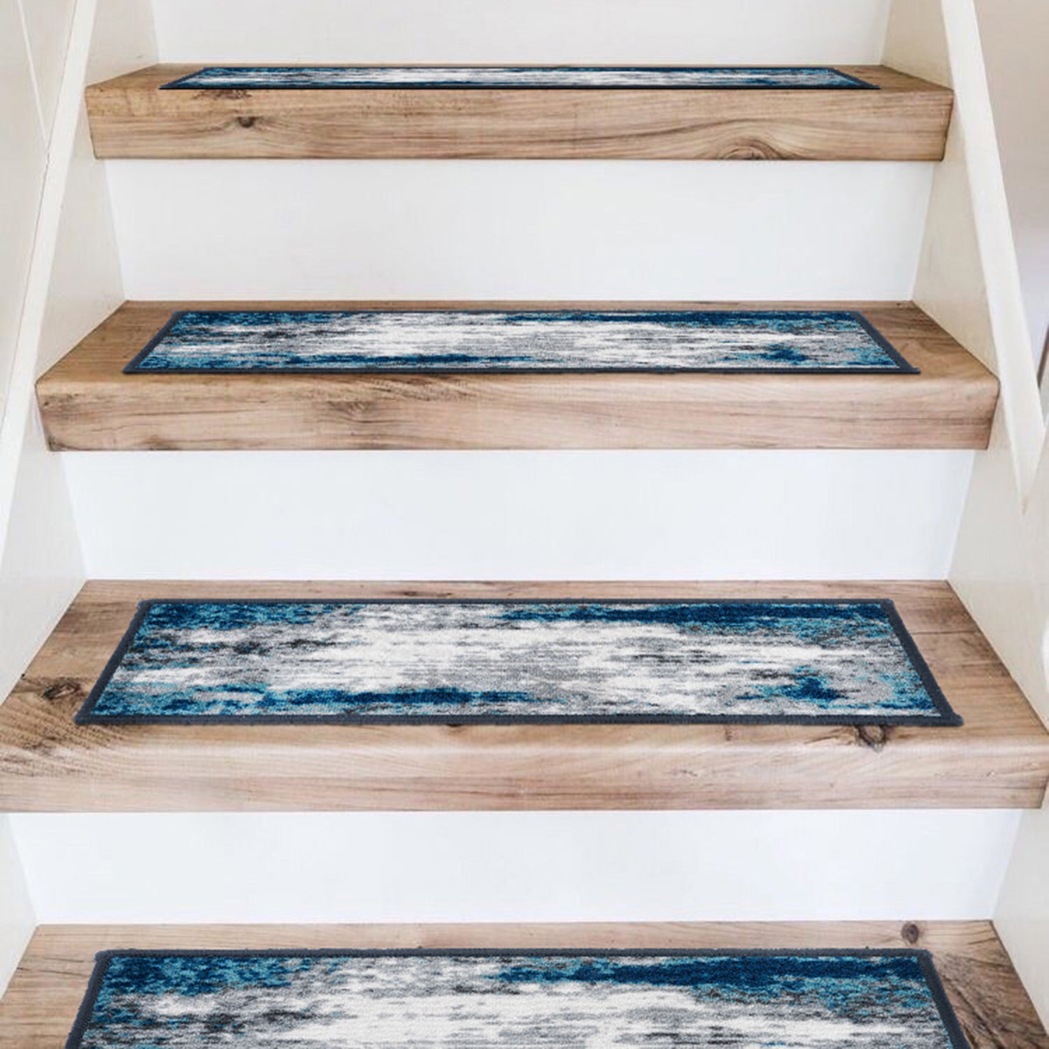 Enrich your stairs with these stunning, yet practical and decorative stair treads. The distressed abstract design adds interest and style to every step. The rubber backing provides additional safety for climbing kids and pets. At 26 inches x 8.6 inches, these machine washable treads are ideally sized for the majority of staircases.