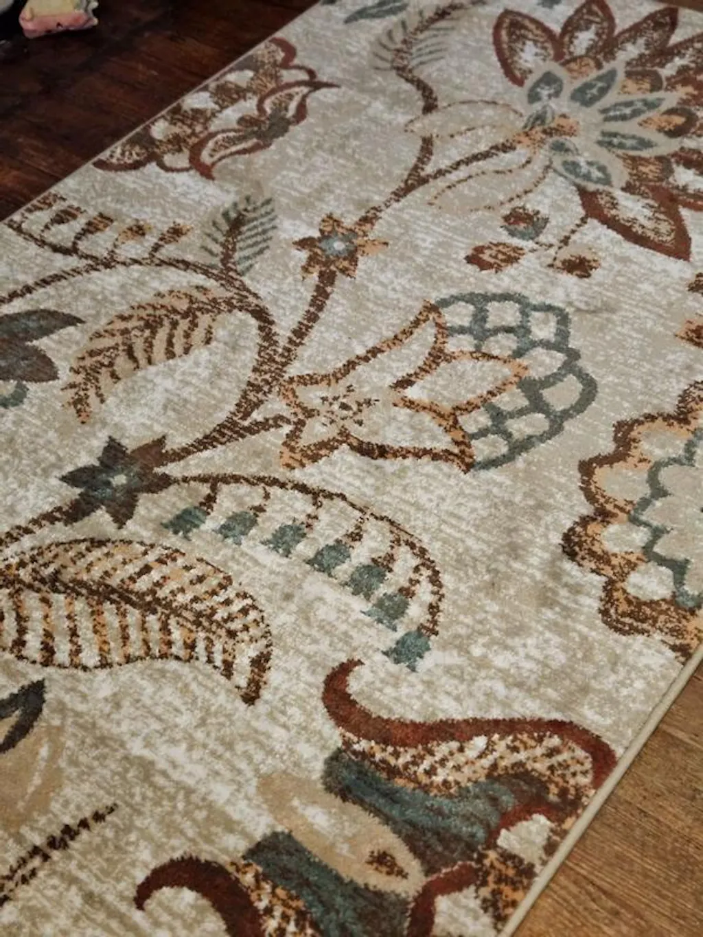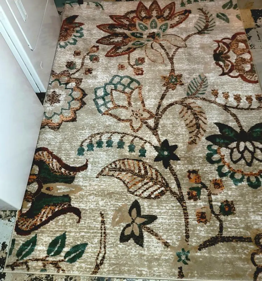 Refresh your room with the natural elegance of this beige area rug featuring oversized floral and botanical motifs in soft teal, rust, ivory, and brown tones. Power-loomed from 100% polypropylene with a jute backing, this rug blends texture, comfort, and practicality for any space. Its 0.39-inch low pile height makes it ideal for high-traffic areas, while the distressed background effect gives it a lightly weathered, lived-in charm. Perfect for transitional, cottage, or farmhouse-inspired interiors.