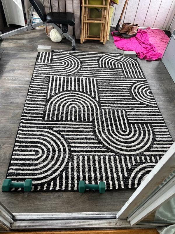 Enhance your home's ambiance with our modern geometric striped minimalist-style area rug, designed in a captivating palette of black, gray, and ivory. This geometric area rug seamlessly marries comfort with contemporary refinement. With its plush 0.39-inch pile height, it delivers a luxurious underfoot sensation and facilitates effortless maintenance through spot cleaning and vacuuming. Precision-engineered from top-quality polypropylene fibers and matched with a robust jute backing, this rug ensures both longevity and timeless visual appeal.