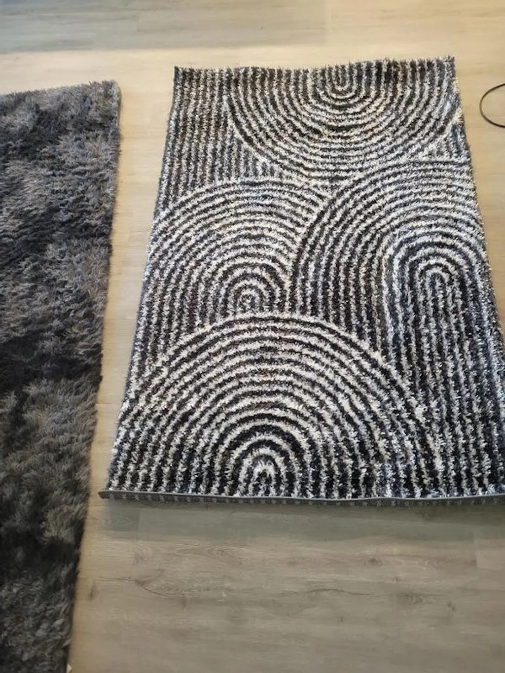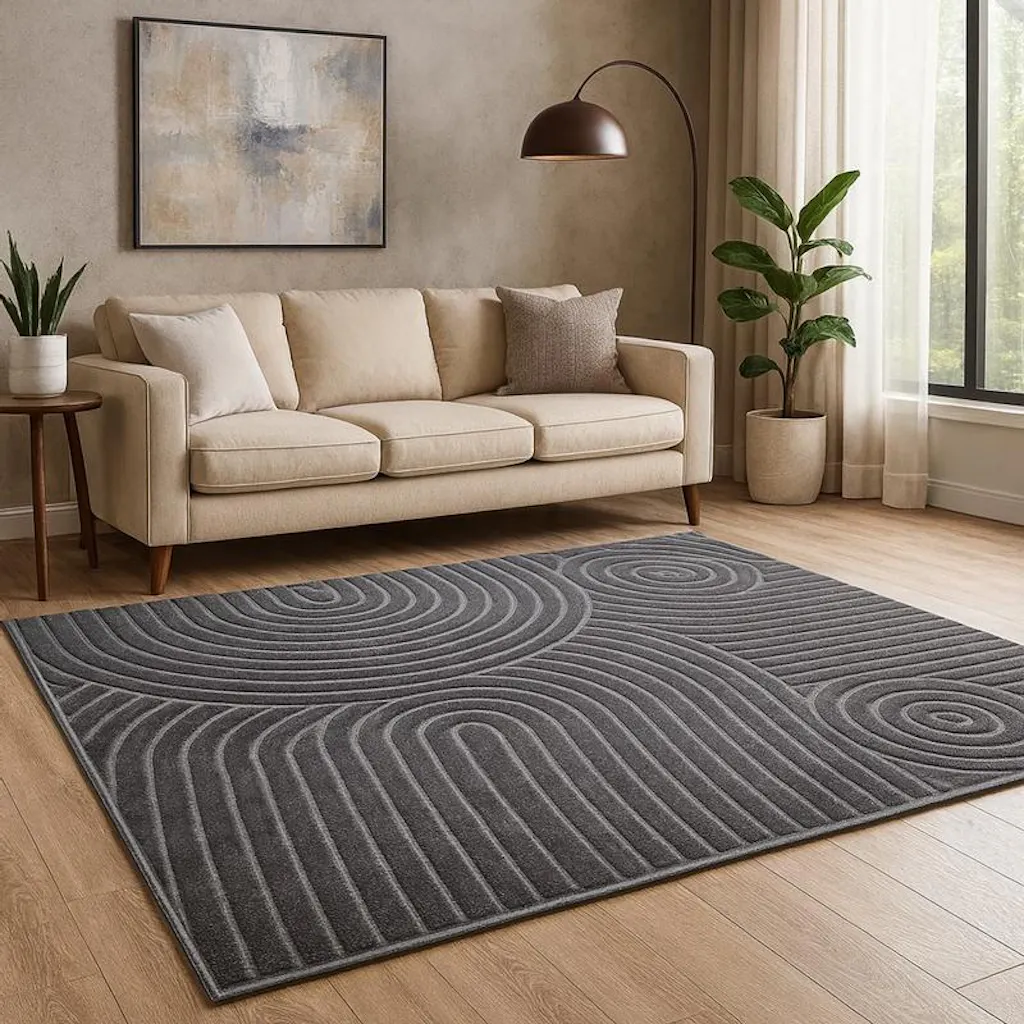 Bohemian, Contemporary style. Style your bold accent spaces with this Concentric Circle shag rug featuring a cozy medium pile. The soft Concentric Circle pattern adds inviting texture that families love. This version comes in deep Anthracite Dark Gray. Its Concentric Circle design and medium pile provide a stylish yet cozy layer for living rooms, bedrooms, or play spaces. This rug introduces bold, zigzag movement and enhances depth with its smoky gray tone, making it a versatile choice for modern households. Crafted from 100% Polyester with a durable jute backing, it's kid and pet friendly, easy to clean, stain and fade resistant, and no shedding. Vacuum often, spot clean as needed, and rotate periodically for even wear.