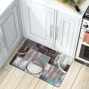 Beautiful Contemporary Abstract Circles Anti Fatigue Standing Mat . It’s so pretty in a Gray shade and measures 18"x30" . I cook a lot , so this anti fatigue May is absolutely required for me . It’s easy to clean the surface with soap and water if any sauces spill on it . It hasn’t stained at all and the sauces lifts off easily. This is absolutely essential for me as I like my kitchen clean and it lifts off easily from the ground to sweep and mop the floor too . Modern design and color is just perfect for my kitchen .