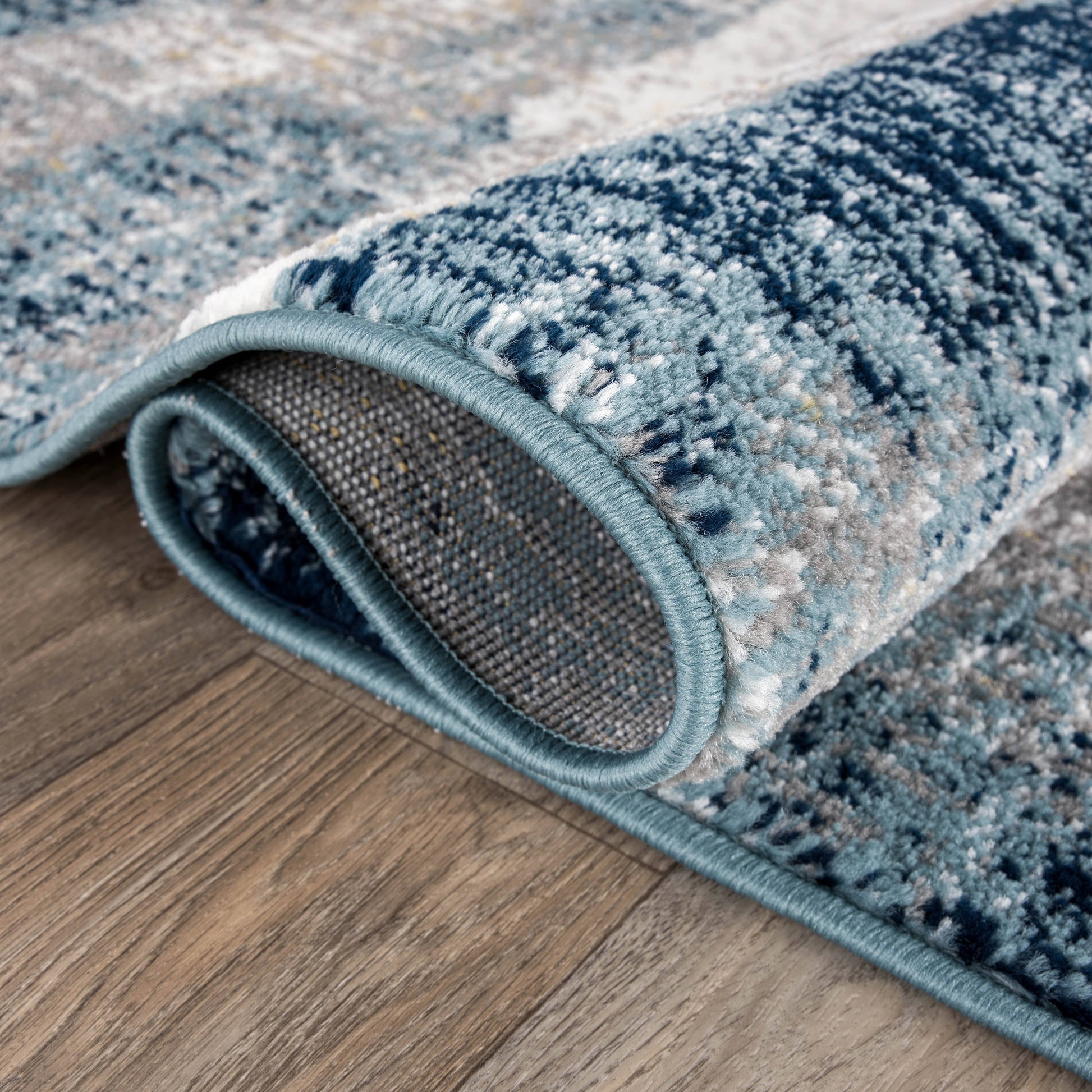 This is a nice area rug that comes in many different styles and colors. I picked one that has shades of white, blue and gray. It comes rolled up and is packaged well. I left it on the floor upside down for over 24 hours to try to get the bends out of it. The one short end was actually folded and I'm still trying to get it to lay flat. It also still is a little bumpy from being rolled, so it's not flat yet. It's been laying out for over a week now. Hopefully soon it will lay flat. I keep putting heavy things on it overnight at the corners.