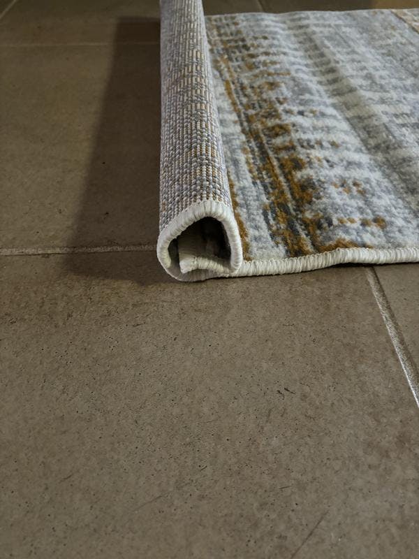 This rug is definitely a lot more than I expected it to be look wise. Most of the time they look a lot different in the pictures than they do in real life. The yellow in it is more of an accent, not the start of the show which I actually like a lot better and it is a really pretty sunshine yellow color. Cons: It is taking some time to get the creasing out of the rug but that is to be expected and I will also need to get a rug pad to do underneath because this thing slides all over the place.
