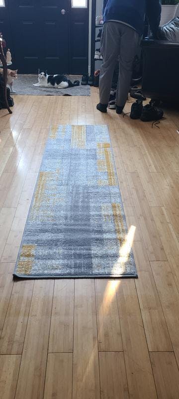 This beautiful area rug brings a modern look to my living room's decor. It's made of high-quality material, and the fabric design and colors giving it a unique look. It definitely helps bring my living room entrance together with functionality and elegance.