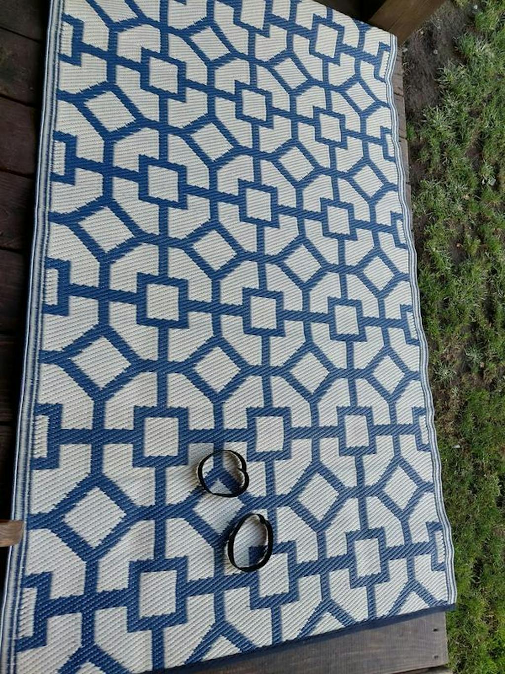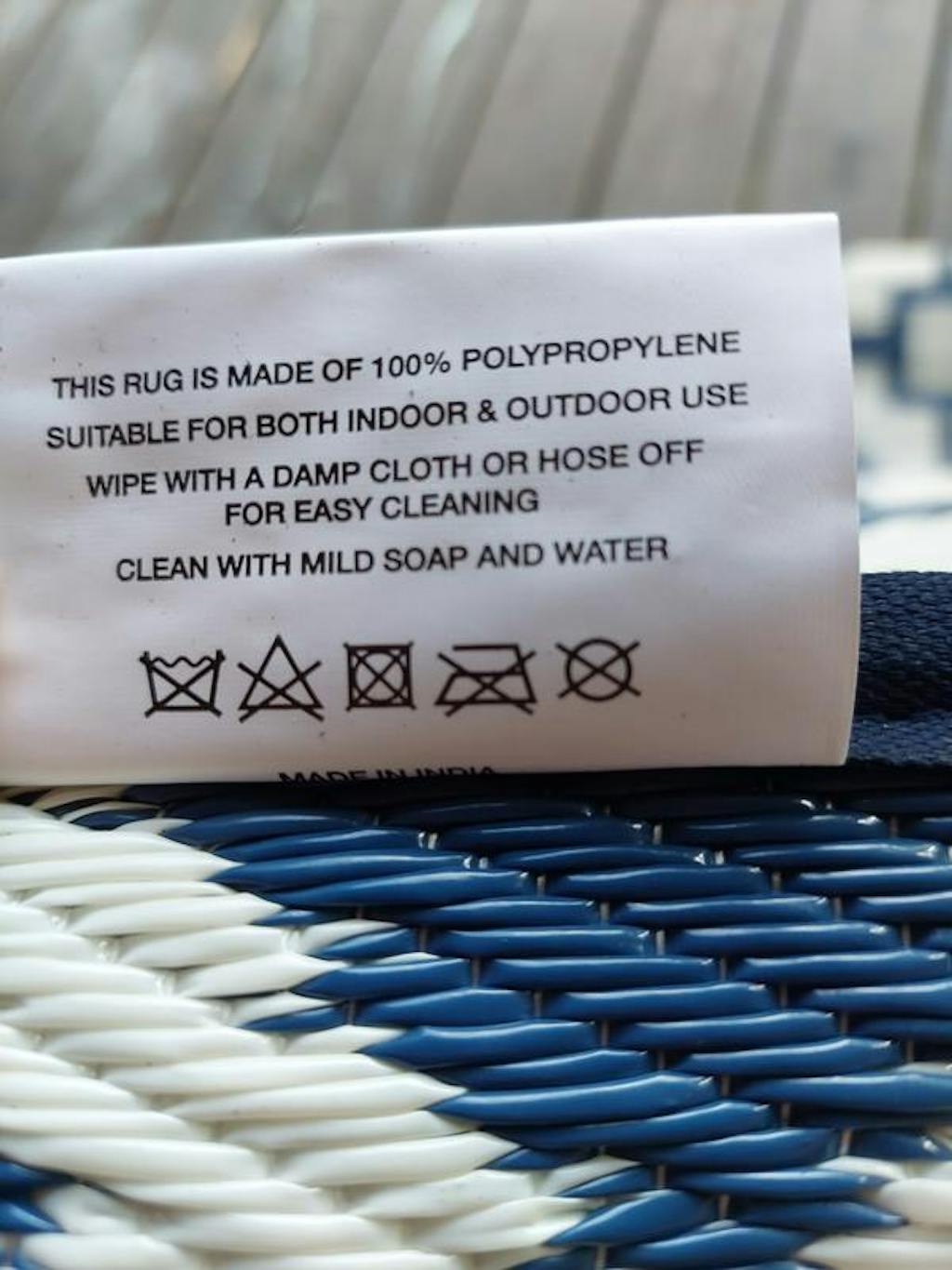• Reversible crease-free waterproof premium recycled plastic outdoor rugs. Easy Care: These stain resistant rugs are easy to maintain. When spills and accidents occur, blot the stains, rinse with a hose, sweep or use a leaf blower to remove dirt.Rug pad recommended for indoor uses only.