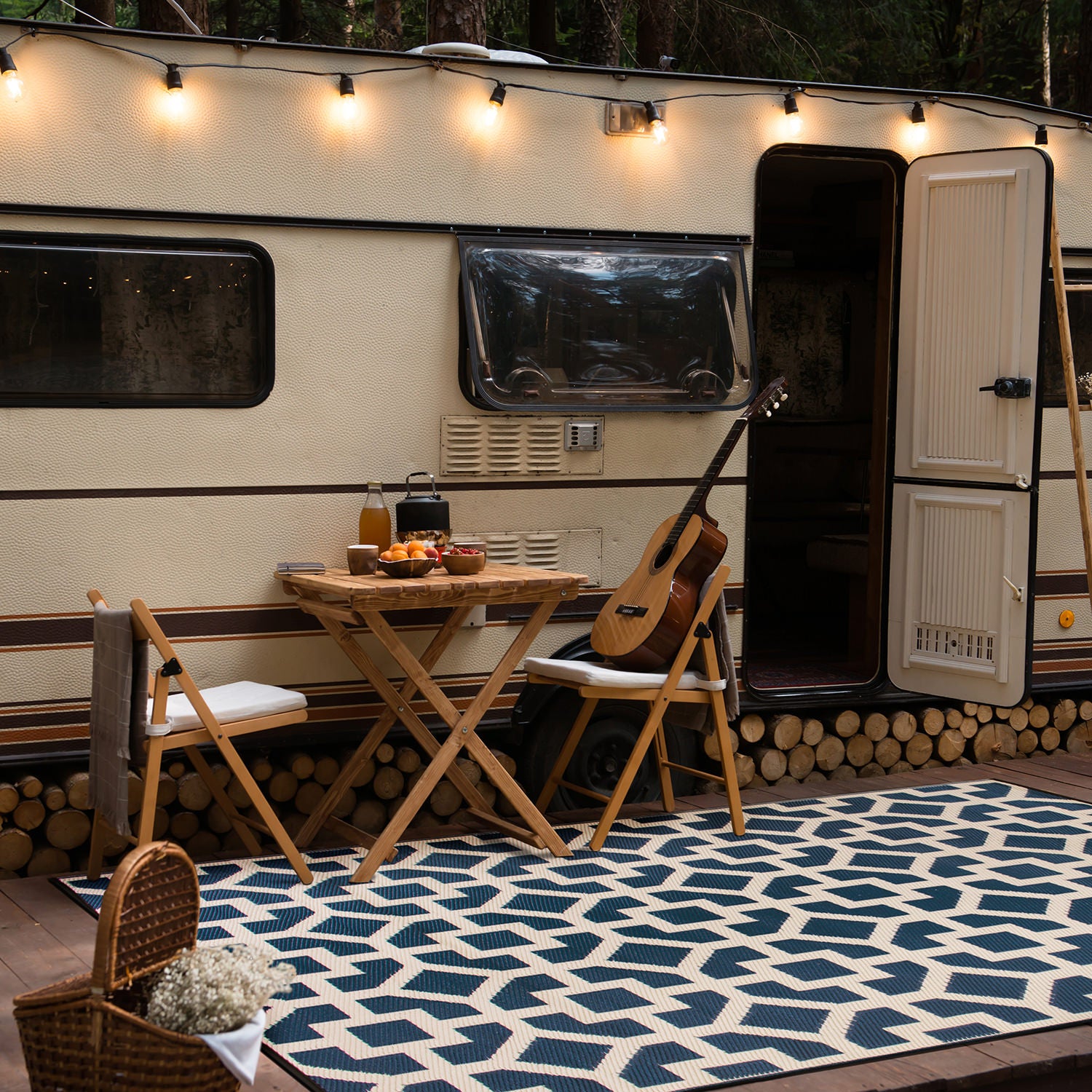 Love the geometric look and the navy really pops I was able to redo my outdoor space with this rug as the main focal point and it looks great I love how easy it was to move around and find the best area for it the design and materials used really work well for me