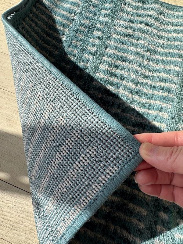 World Rug Gallery Contemporary Minimalistic Stripe Lines Area Rug is more of a runner shape at 2 feet by 7 feet. It is a great size for a hallway or next to the bed. The pattern is modern and attractive in shades of blue. The pile is a typical man made carpet material and feels fine on bare feet. The rug is on the thinner side and it might need something to keep it in place on a hard surface. It looks like it would wear well and be easy to clean. All in all, this is a perfectly fine rug for the $40 price point.