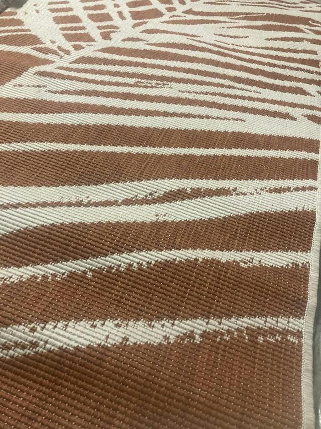 Indulge in the ultimate comfort, durability, and versatility with this reversible rug that effortlessly complements both indoor and outdoor settings. Crafted in Belgium using state-of-the-art machinery, this rug is meticulously machine-made with 100% polypropylene, ensuring superior quality and long-lasting performance. Its dual usage capability makes cleaning a breeze, providing convenience for everyday use. The tropical floral design accompanies a sleek palm frond pattern, bringing a touch of exotic beauty and visual allure to transform any space into a captivating haven of style and elegance.