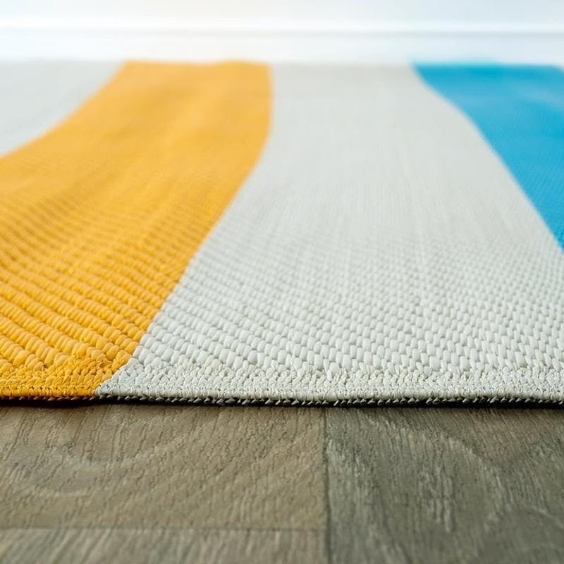 This blue 5'x7' World Rug Gallery Contemporary Stripe Reversible Recycled Plastic Polypropylene Outdoor Reversible Straw Area Rug has bold colors and adds style to our patio. It’s easy to clean, cute, & durable.