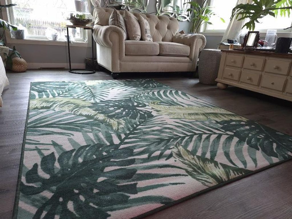 • Energize your living space with this resilient and stylish modern palm leaf tropical floral rug. Ideal for high-traffic areas, it's also pet-friendly and machine washable for added convenience. This rug is remarkably easy to clean, with its looped nylon pile measuring a mere 0.2”, reducing dirt accumulation and enhancing wear resistance. Plus, the non-skid backing eliminates the need for a rug pad, ensuring safety on all types of floors.
