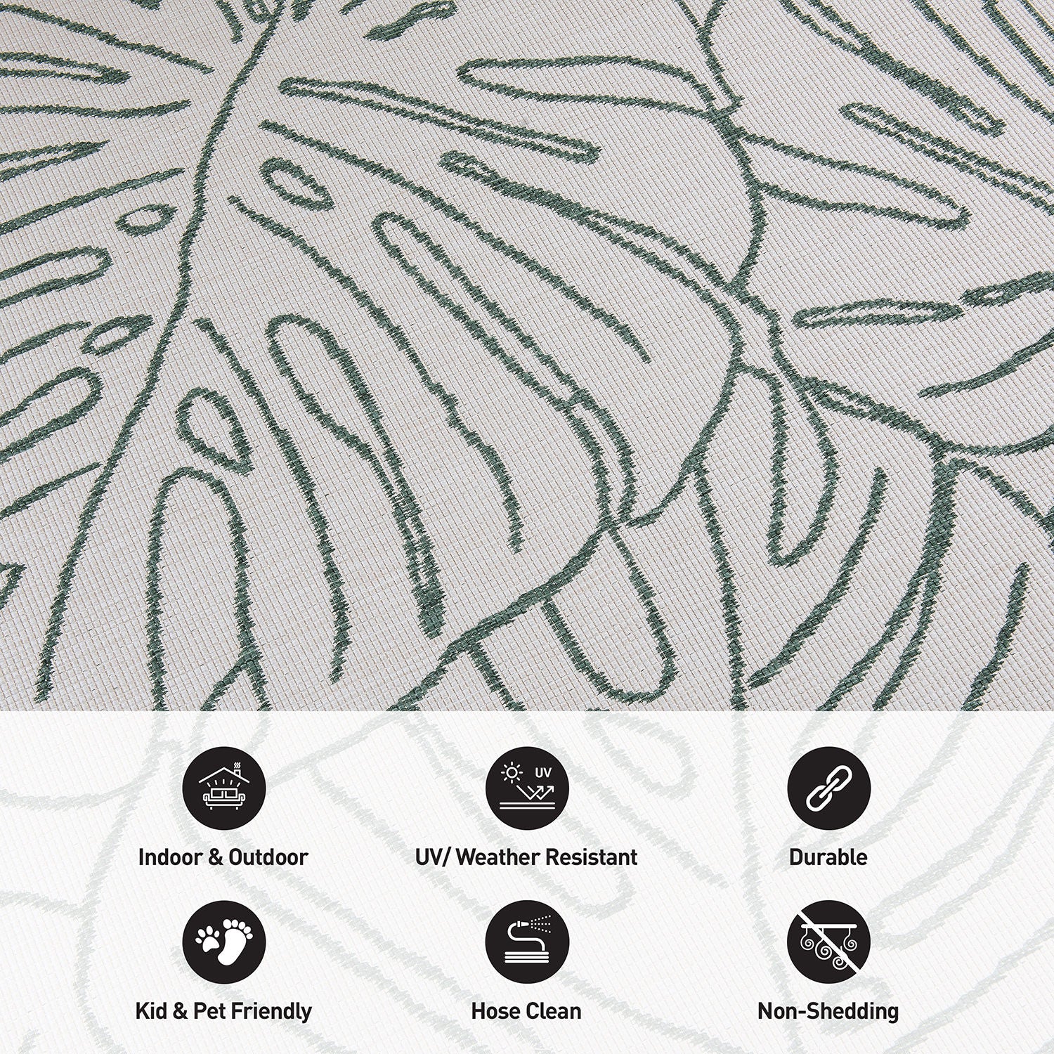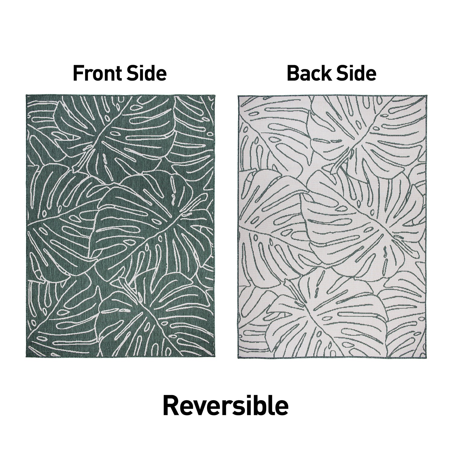 • Durable Indoor/outdoor reversible rug. Flatweave weather-resistant construction.