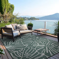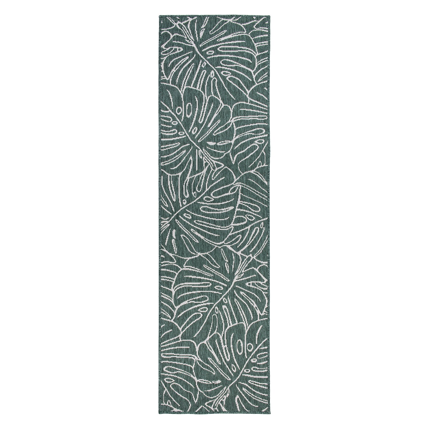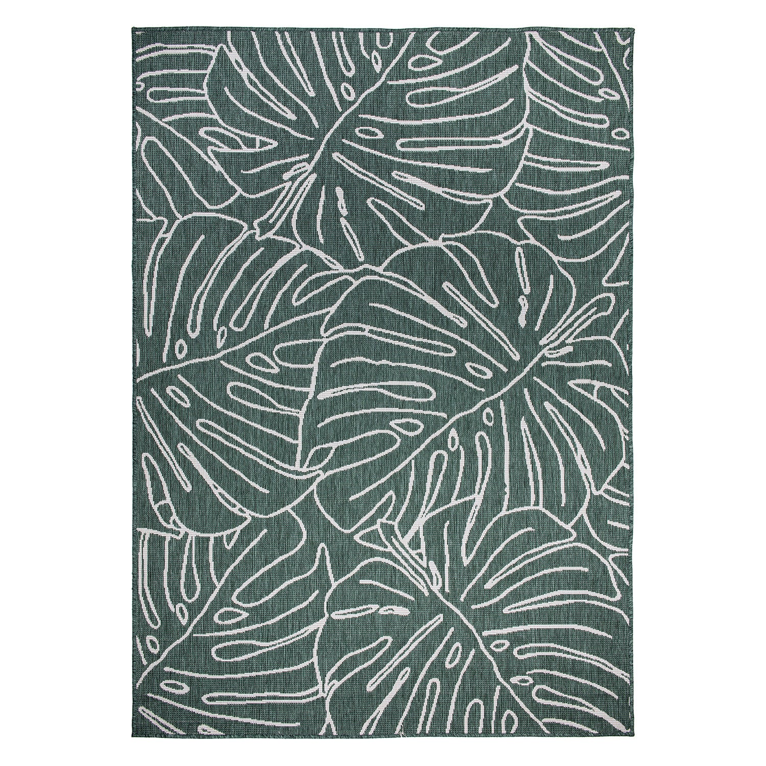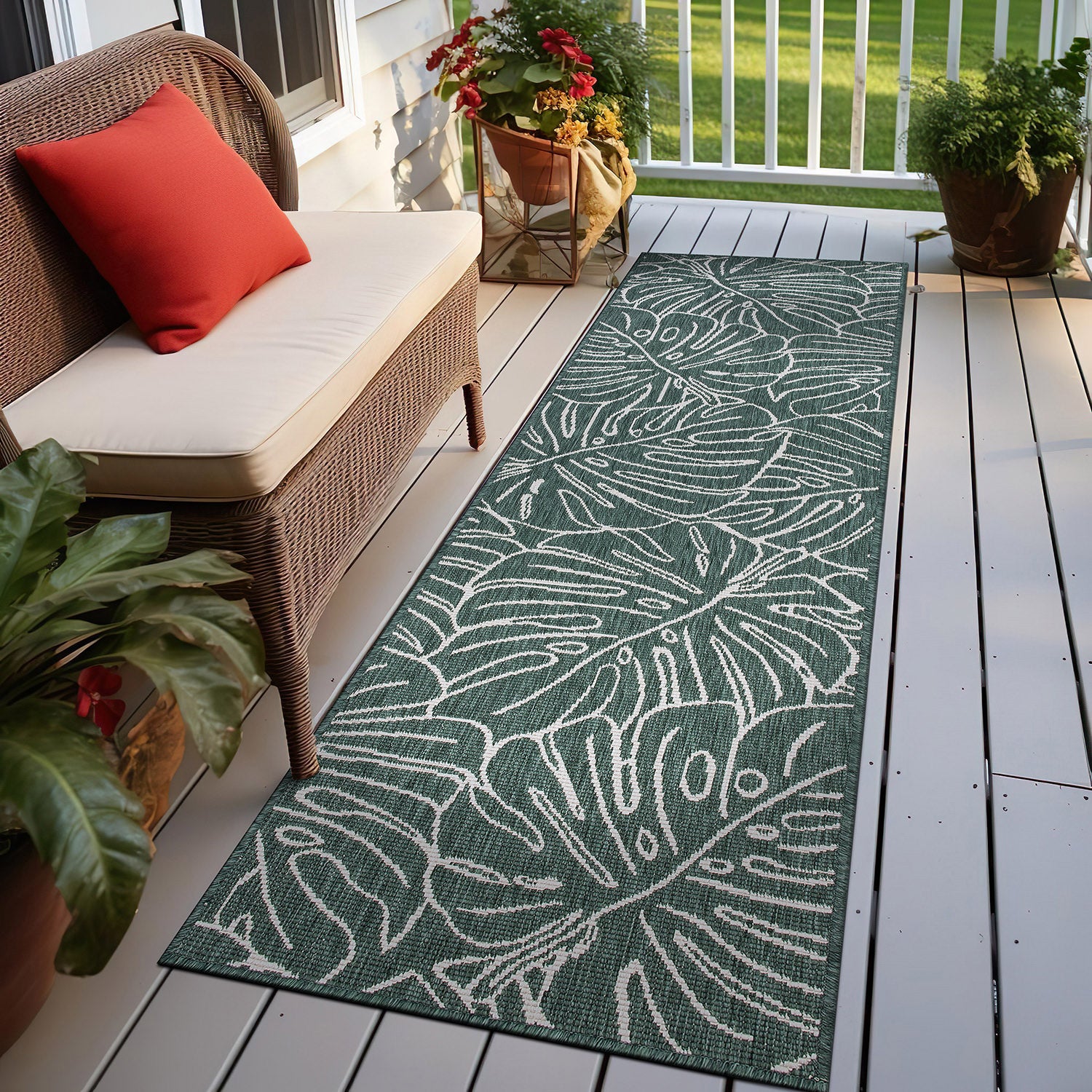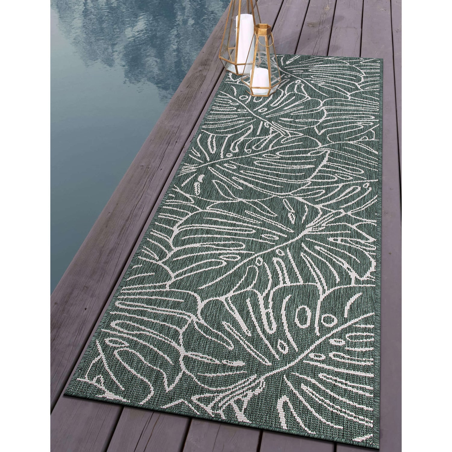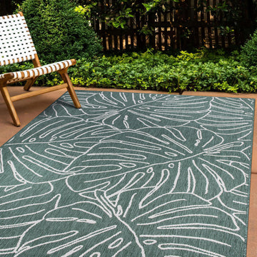 My World Rug Gallery Contemporary Tropical Leaves Weather Resistant Reversible Indoor/Outdoor Area Rug looks so nice. It's easy to vacuum and care for. It's made well and will last for a long time. The tropical leaves pattern matches my theme very well. It's just gorgeous and feels great under my feet. It's reversible so I can choose whether to show more blue one day and more white the next day just by flipping it over.