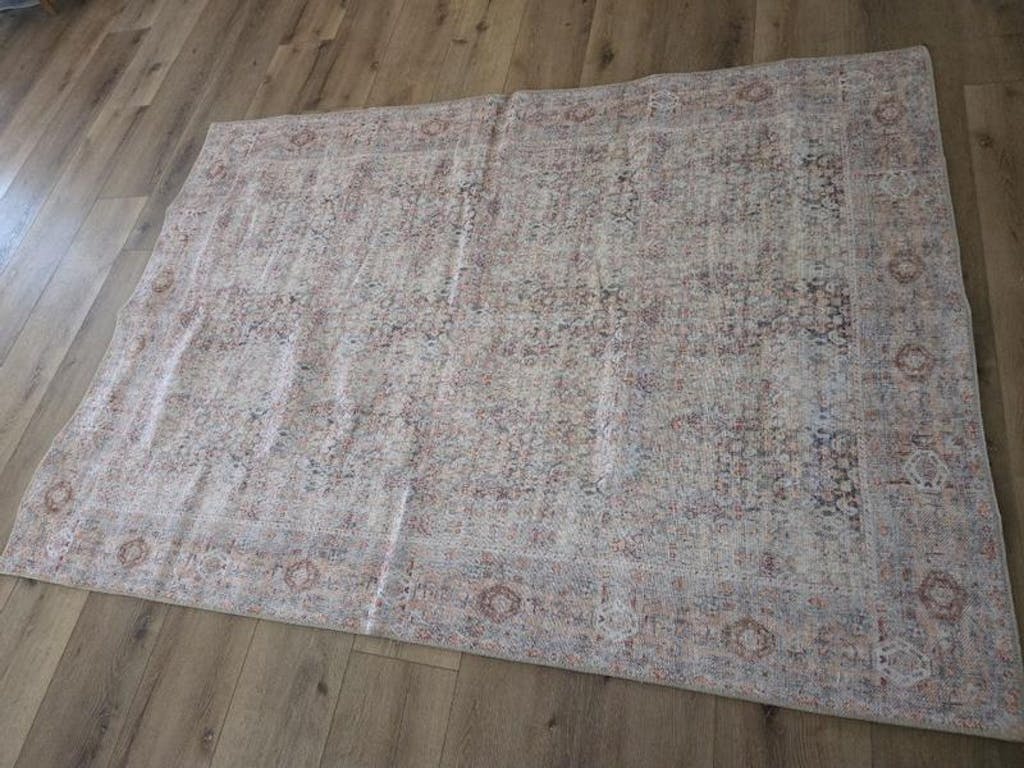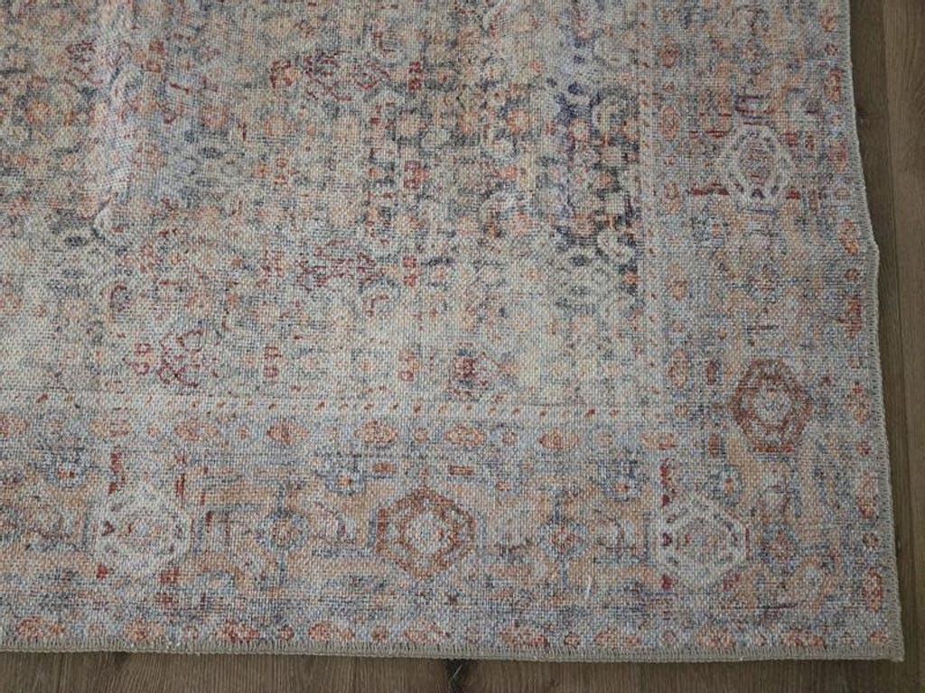 Bring soft vintage style to your space with this multi-tonal rug, blending terracotta, ivory, and gray for a gently distressed look. The detailed all-over pattern offers a timeless foundation that works across traditional, boho, or transitional spaces. Made from OEKO-TEX® certified recycled polyester, this flat-pile rug fits easily under furniture and includes a non-slip backing for everyday function. Machine washable. Ships folded; creases will flatten naturally within a few days.