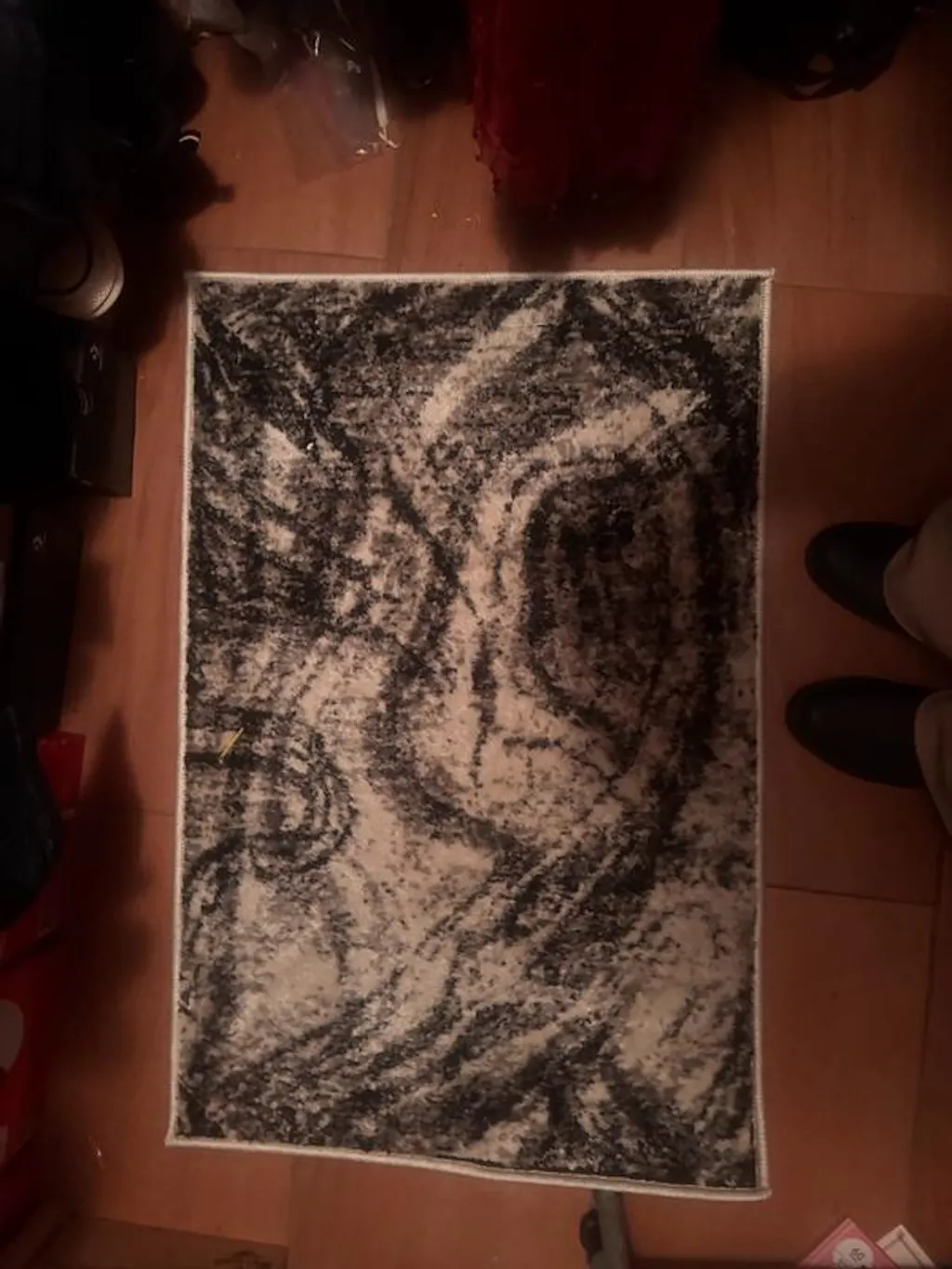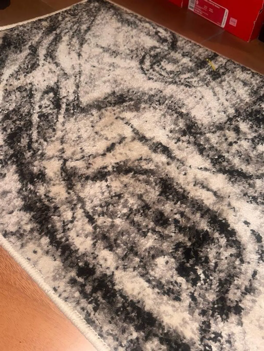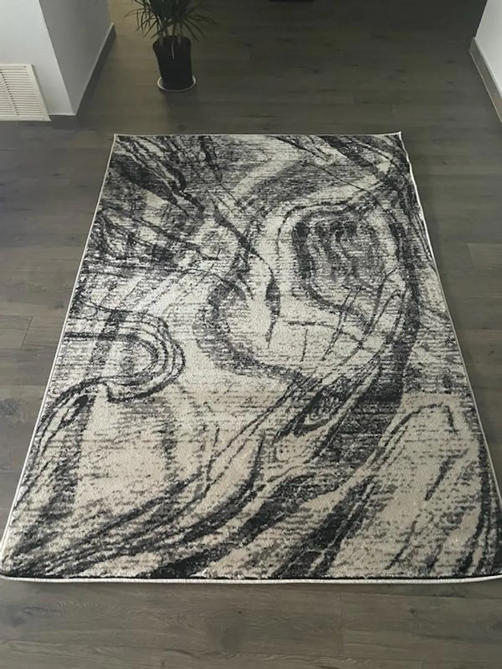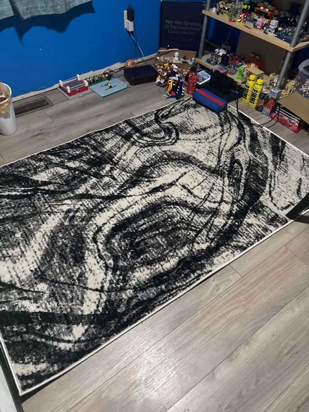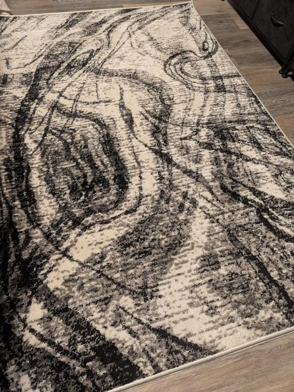 This abstract area rug blends contemporary design with everyday functionality, featuring a unique mix of black, ivory, and light blue hues. The dynamic pattern adds visual depth, making it a statement piece for any room. With a 0.39-inch pile height, it maintains a balanced profile that is both stylish and practical. Built with stain-resistant and easy-to-maintain fibers, this rug is perfect for busy homes that don’t want to compromise on style.