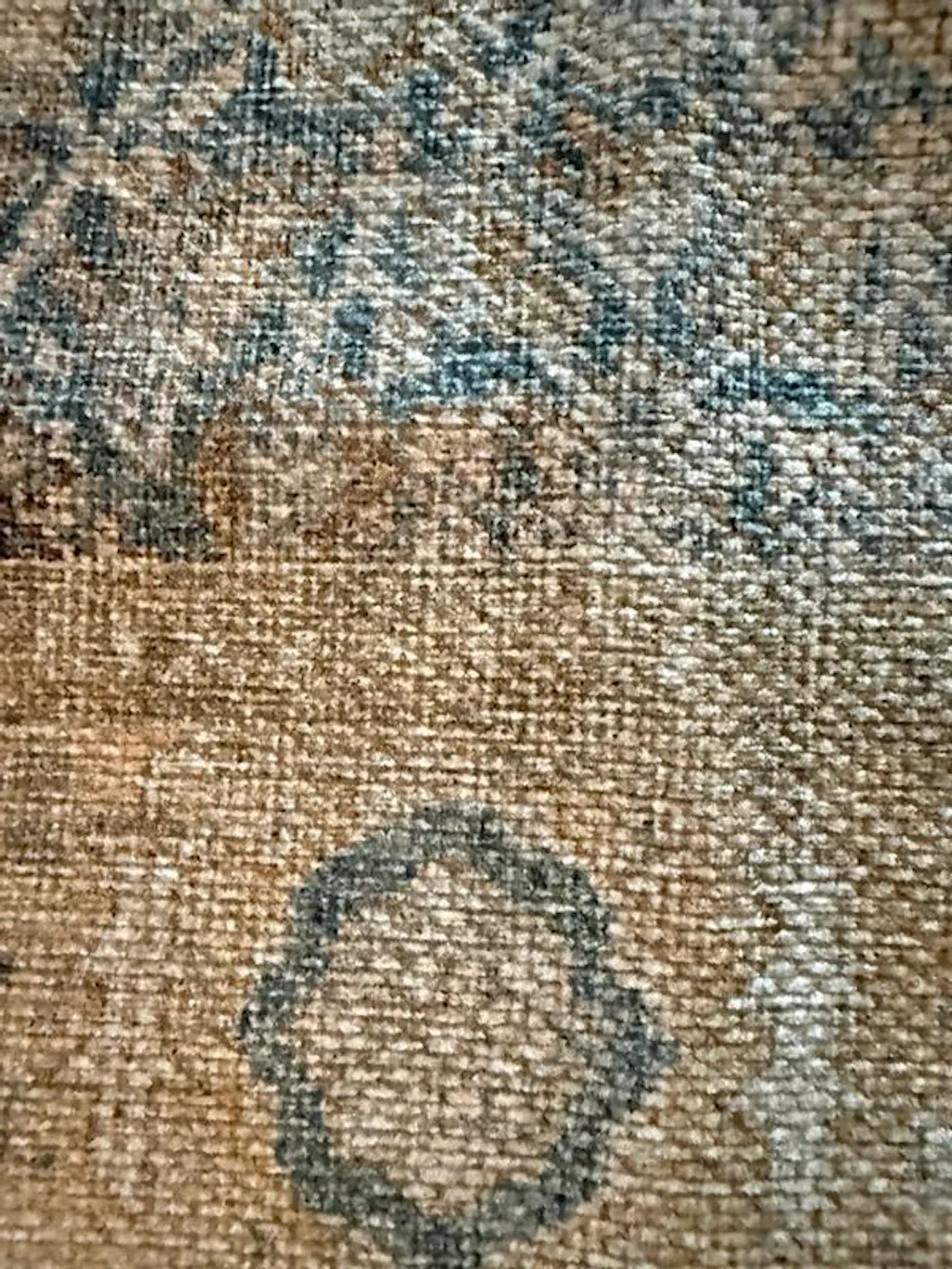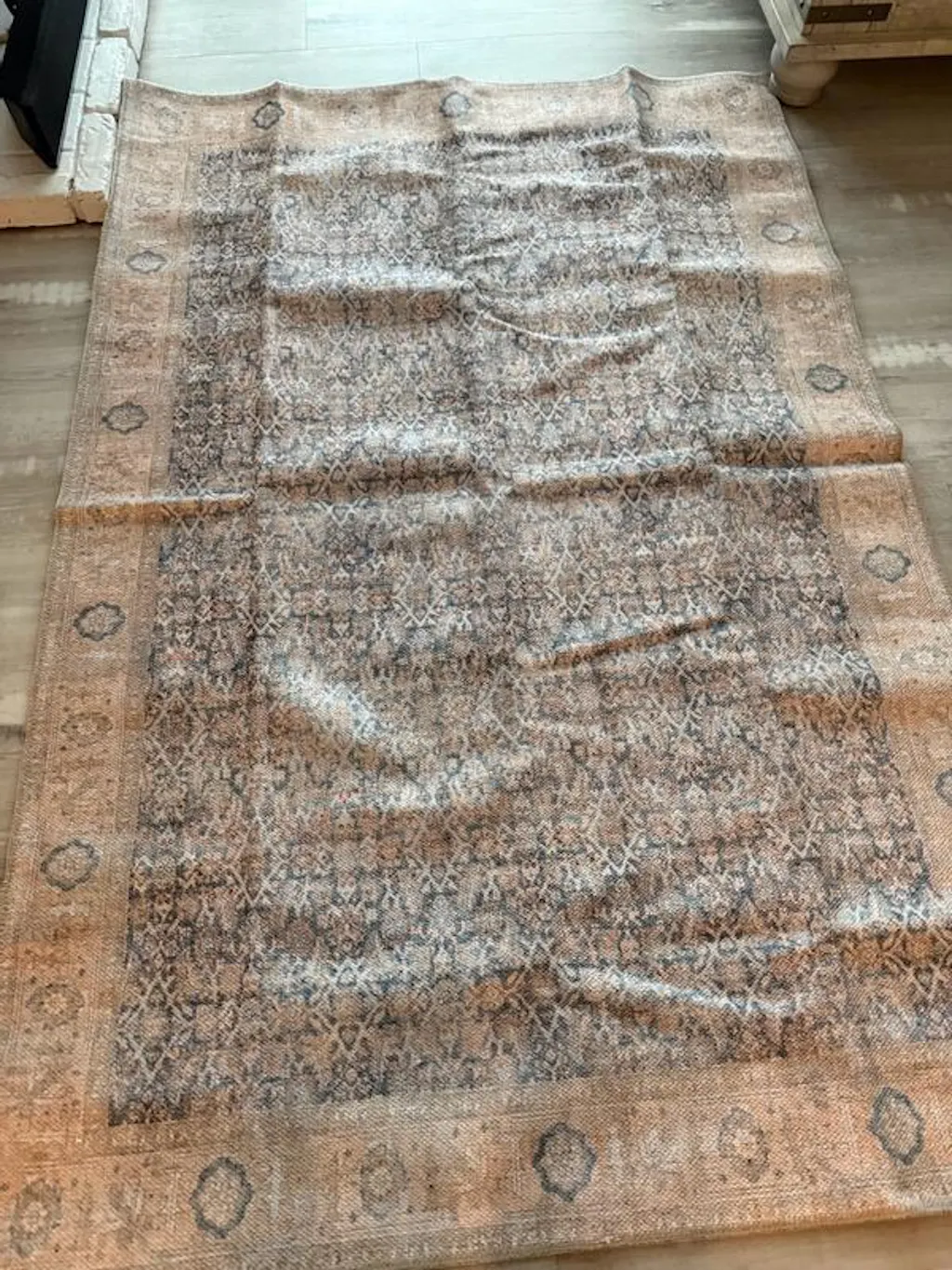 Bring calm elegance to your space with this area rug, featuring a vintage-style all-over pattern in dusty blue, ivory, and beige. The distressed finish offers a timeless, collected look, while the flat-pile surface fits easily under furniture. Made from OEKO-TEX® certified recycled polyester, this rug is machine washable and includes a non-slip backing for everyday ease. Ships folded; creases will flatten naturally within a few days.