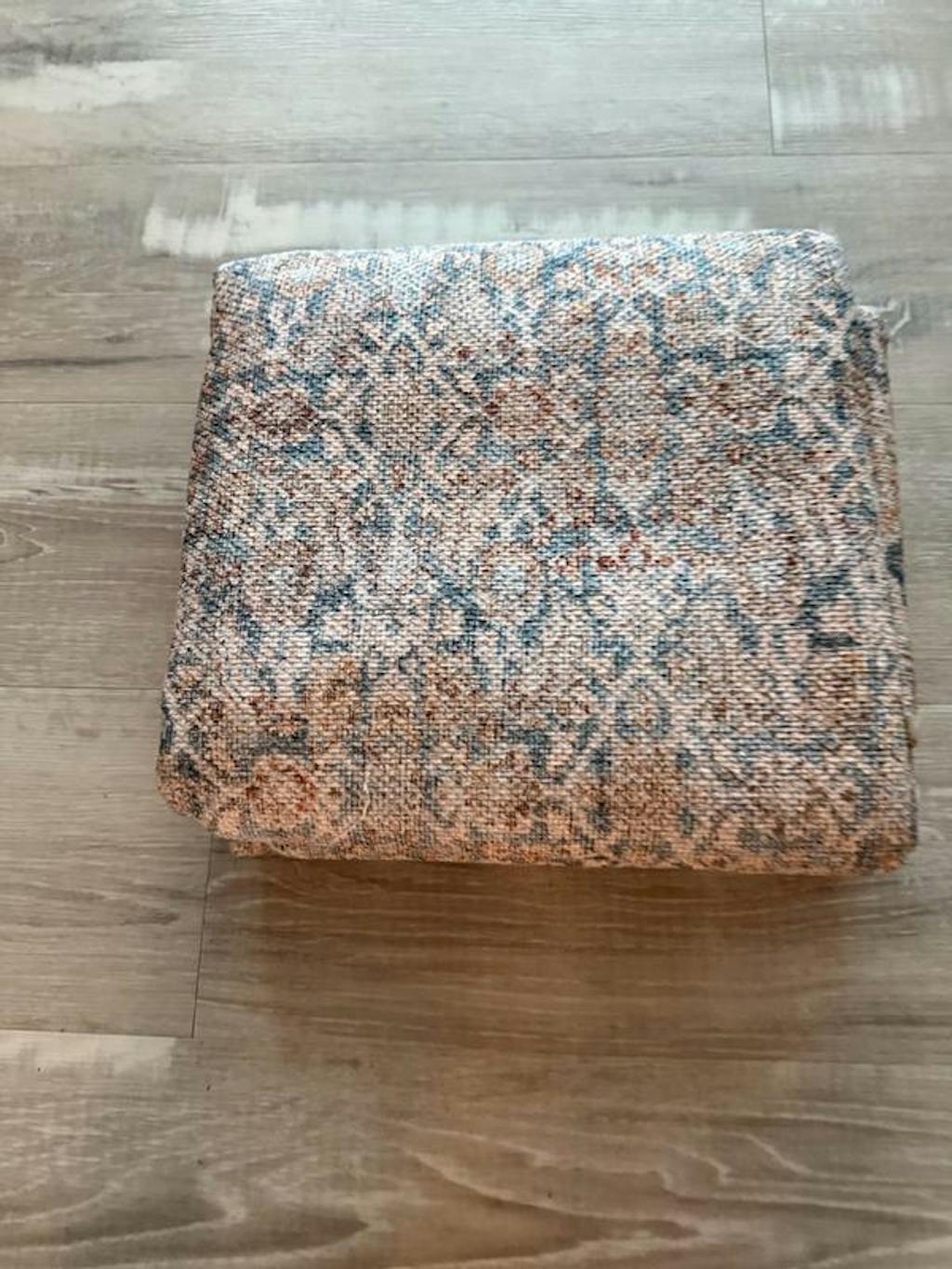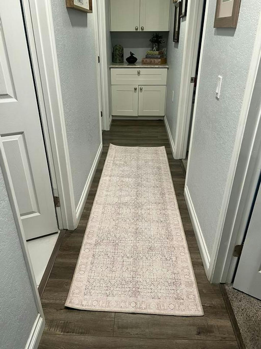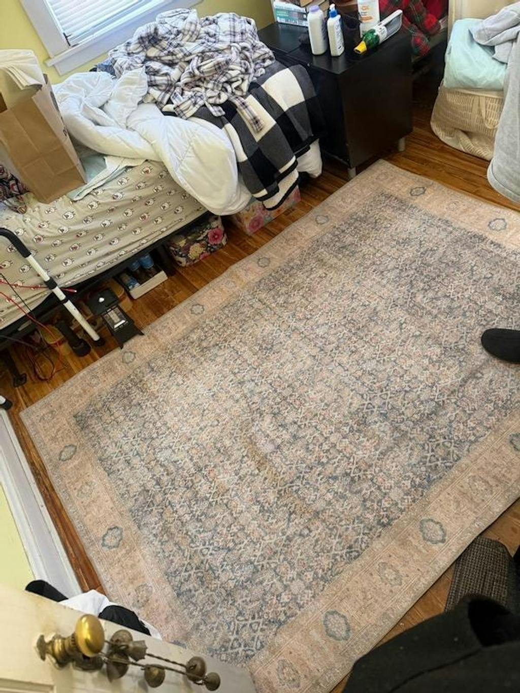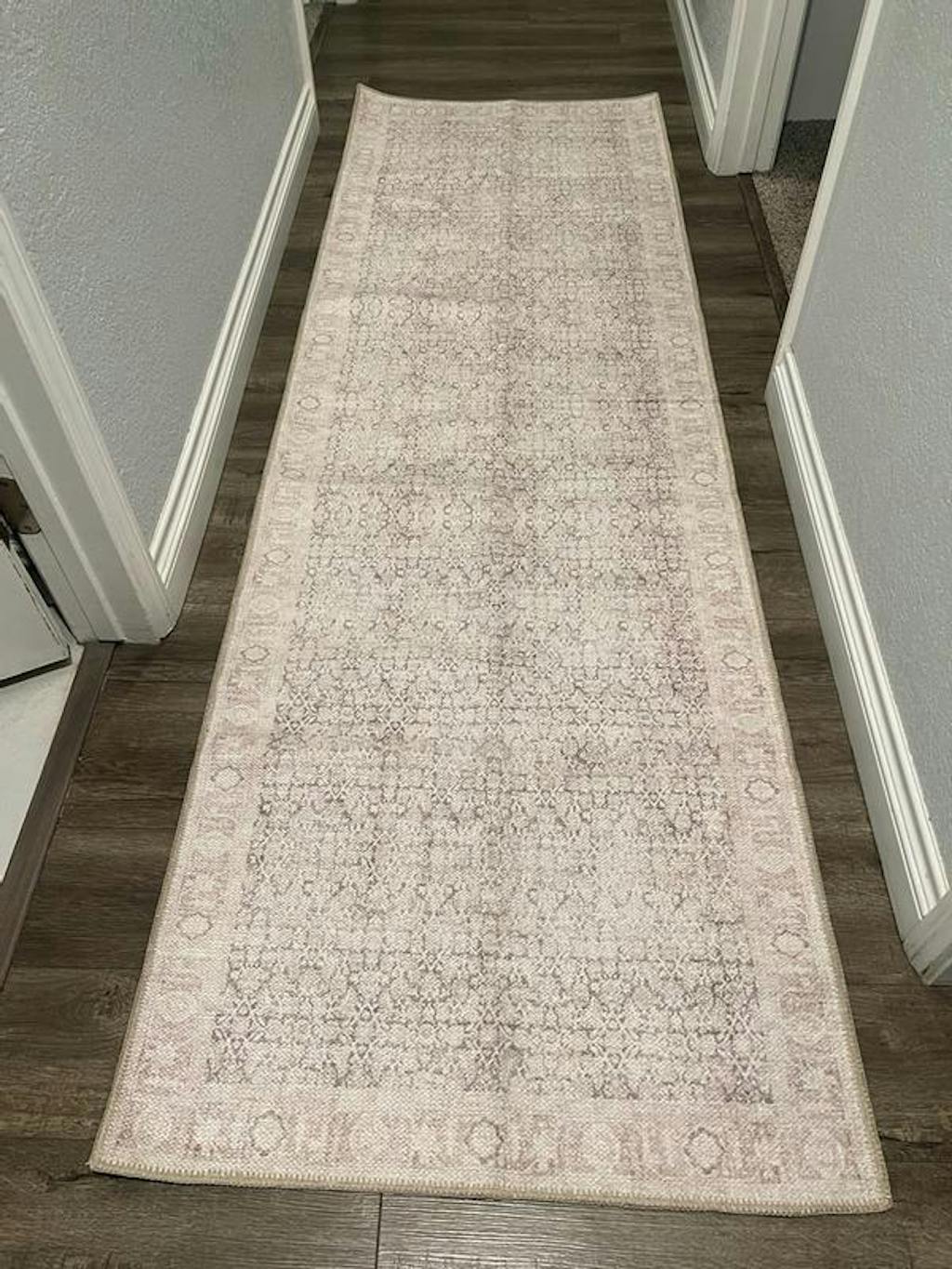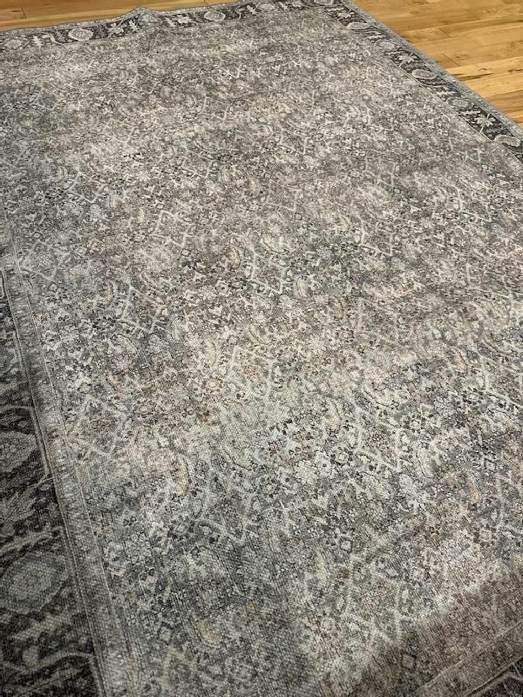 Bring calm elegance to your space with this area rug, featuring a vintage-style all-over pattern in dusty blue, ivory, and beige. The distressed finish offers a timeless, collected look, while the flat-pile surface fits easily under furniture. Made from OEKO-TEX® certified recycled polyester, this rug is machine washable and includes a non-slip backing for everyday ease. Ships folded; creases will flatten naturally within a few days.