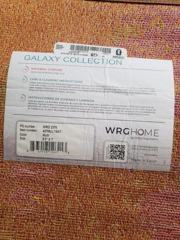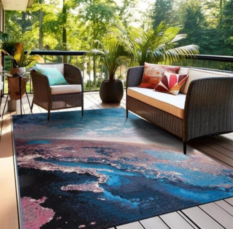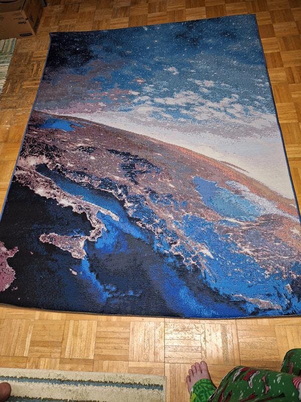 This rug is so beautiful. My son loves it in his backyard patio area. He is into galaxy stuff,so I thought of him when I chose this rug. It's 5'3"×7' which is a great size for an area rug. Excellent quality and very durable. The colors are intense. Made from intricately high-grade polyester yarns for exceptional resilience and longevity. Indoor/Outdoor use. Weather and stain resistance.