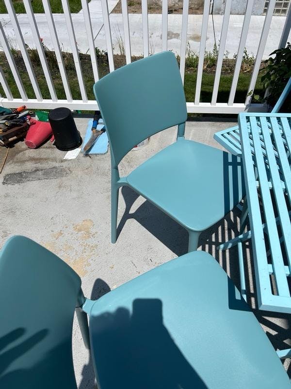 So the blue table I already owned but the chairs are the perfect addition to my set. They’re heavy plastic that will withstand outdoor weather for all seasons. They’re sturdy and stackable so they can be easily stored with we need to. They do get a bit hot in the sun so we plan to put cushions on them. No assembly required as they are ready right out of the box.