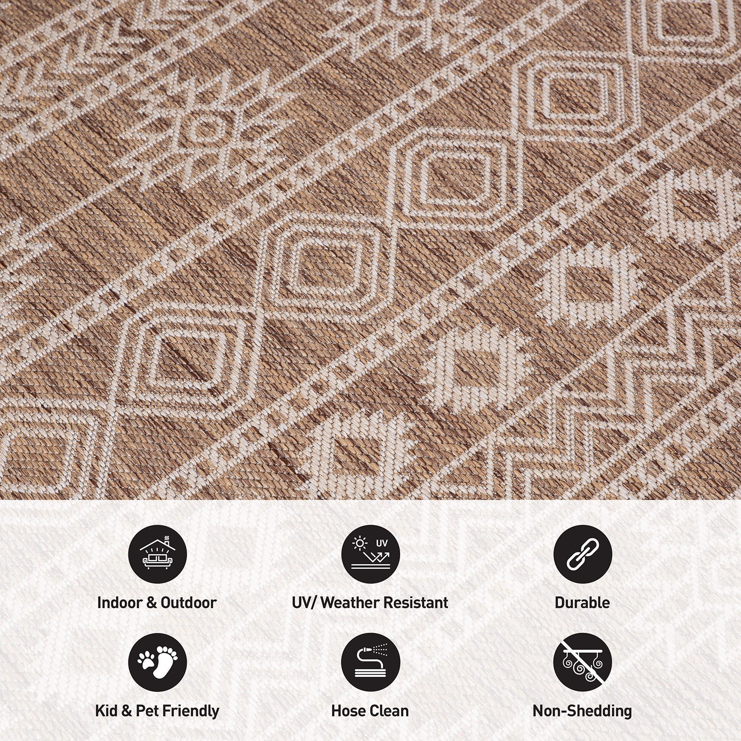 • Indoor/Outdoor area rugs designed with resilience against everyday wear-and-tear, this rug is kid and pet friendly and perfect for high traffic areas of your home such as backyard, patio, deck, screened-in porch, sunroom, living room, dining room, bedroom, entryway, nursery, kid's room, playroom, dorm room, study, or home office. Flatweave weather resistant construction. Rug pad is recommended for indoor use only.