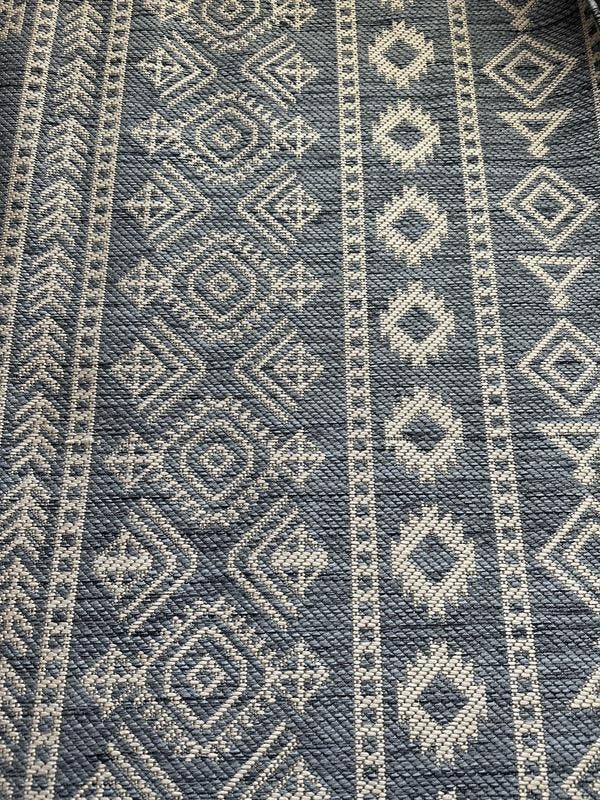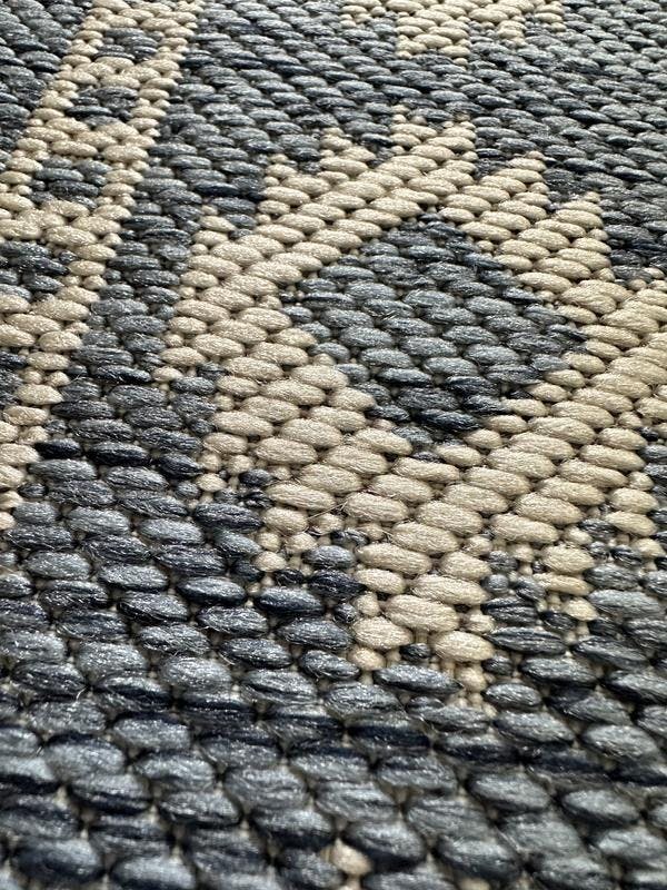 This seems like a pretty durable rug. It's very low profile/thin but tough. A robot vacuum can easier get on and clean the rug. It also is easy to sweep leaves/ twigs off of it when used outside. I love the patten and the blue/white colors are very vibrant. I was pleasantly surprised that it does actually look as nice in person as in the photos. Since this rug is out door /indoor it is sturdy and not very soft. It stands up to foot traffic and does well with furniture being placed on top of it.