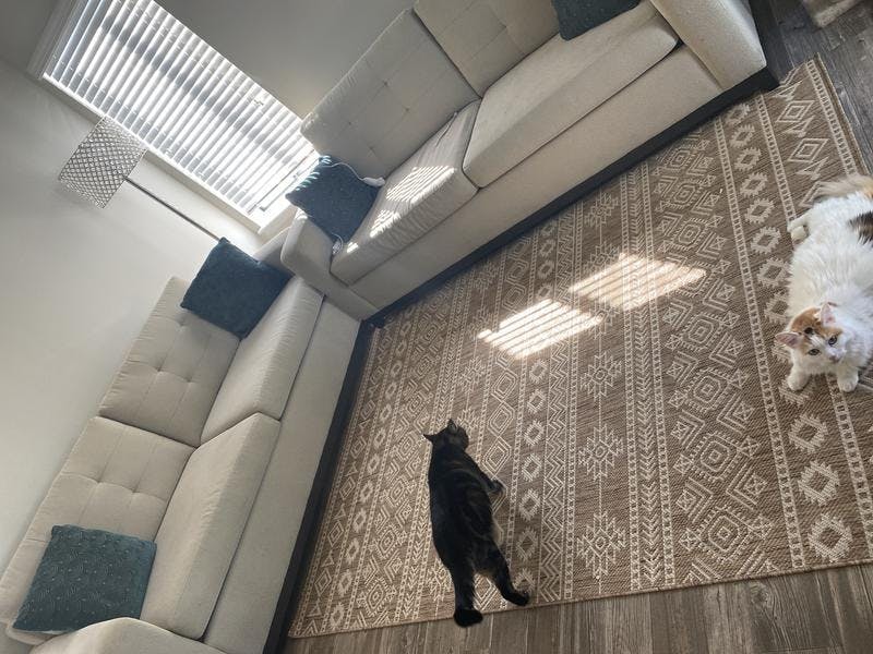 The neutral brown and tan color with the geometric pattern is simply modern chic. It’s understated enough, but yet more than just a natural rug. It complements any minimalistic chic decor without being too busy, and is very comfortable to walk on barefoot. Overall at our house, we all love it.