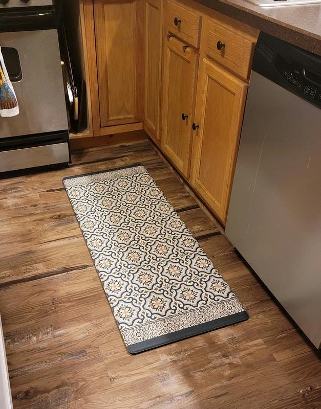 You never realized how important it is to have an anti-fatigue mat until you have one and how you've lived without 1 this whole time this is a game changer it really helps your body when you're washing dishes or you're cooking you don't feel The Strain on your feet it's so cushiony the pattern was adorable it's gonna last a very long time it doesn't look as if it will get flattened or anything like that it holds its shape very well and a great support for your feet legs and body