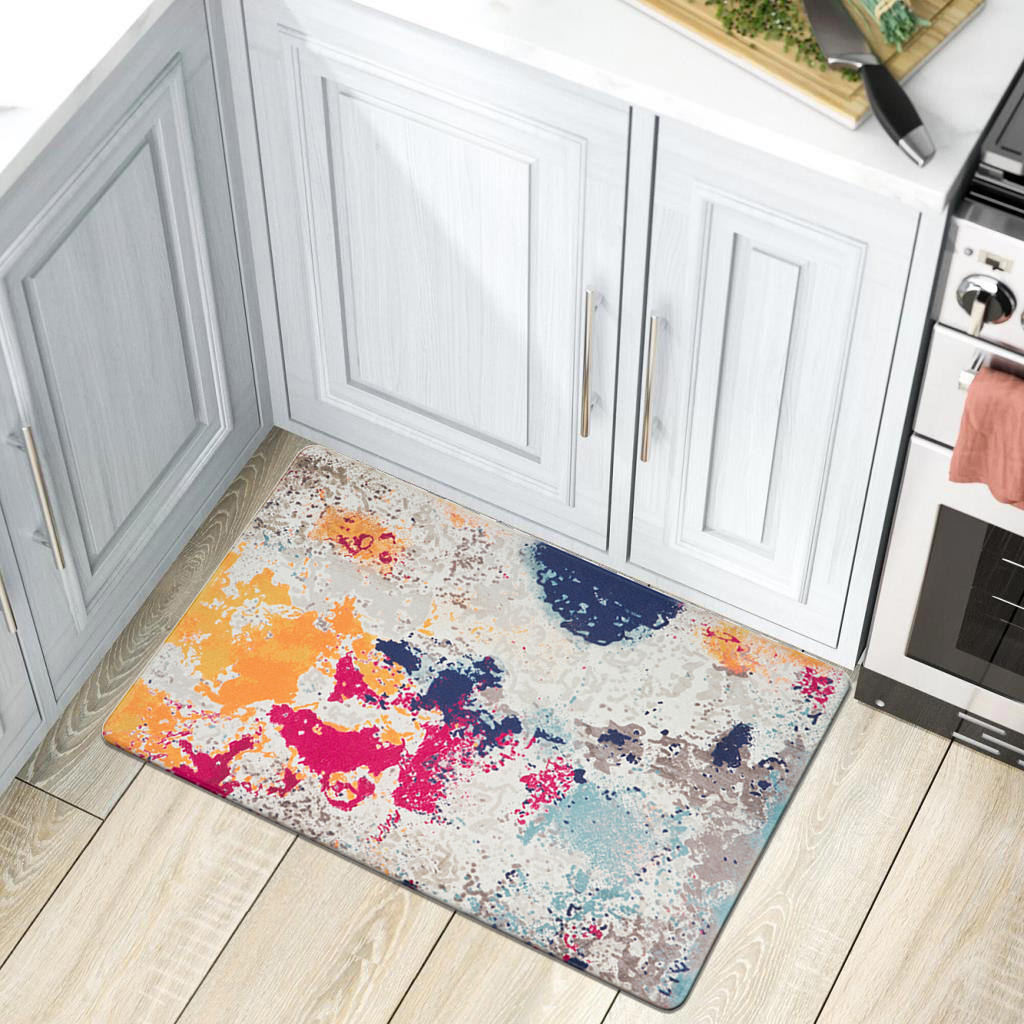 I just love my abstract mat. It has plenty of cushion on the bottom of it and the colors through it is so pretty. This may is the perfect size for me to use any place in my house. And don't have to worried about it moving bc it has a great rubber backing.
