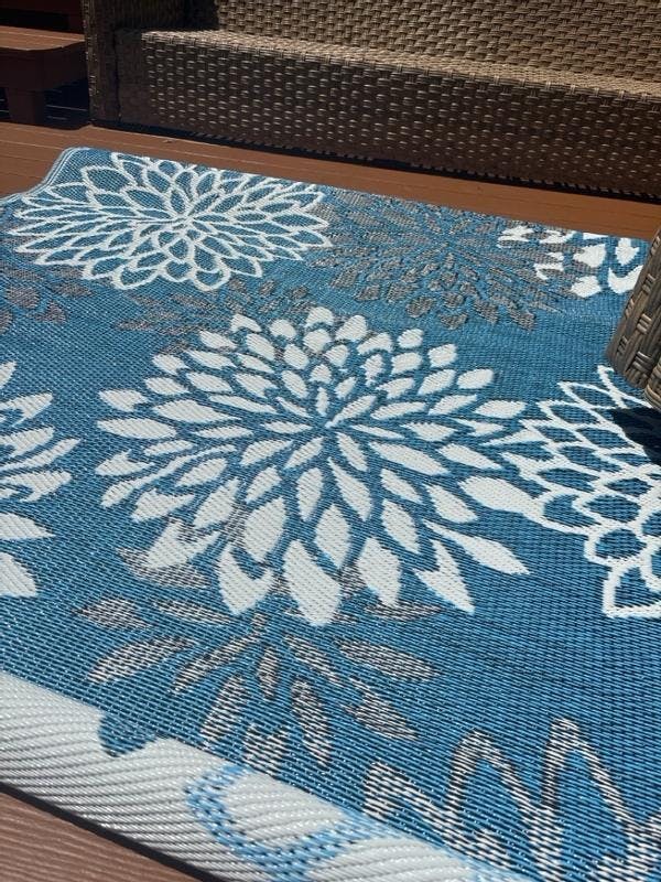 Modern Floral Aloha Reversible Recycled Plastic Outdoor Picnic Mat, Camping Rug, RV Rug - Blue
