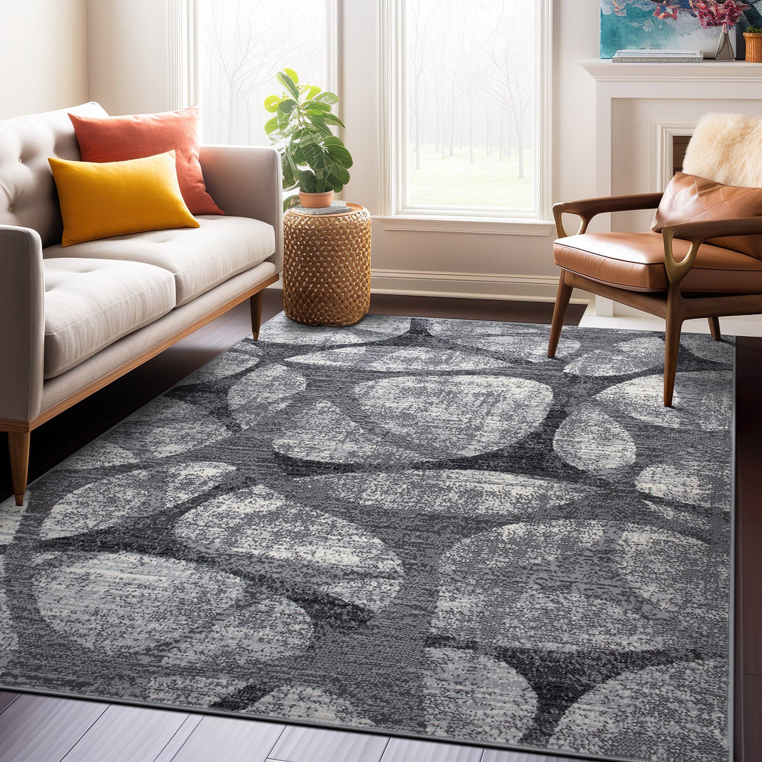 Perfect size and easy design to work around it fits perfectly with the color scheme and is a great material will last a while and looks great in the space. I’m happy with this rug and it looks well made and long lasting
