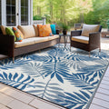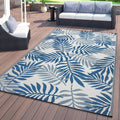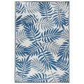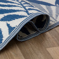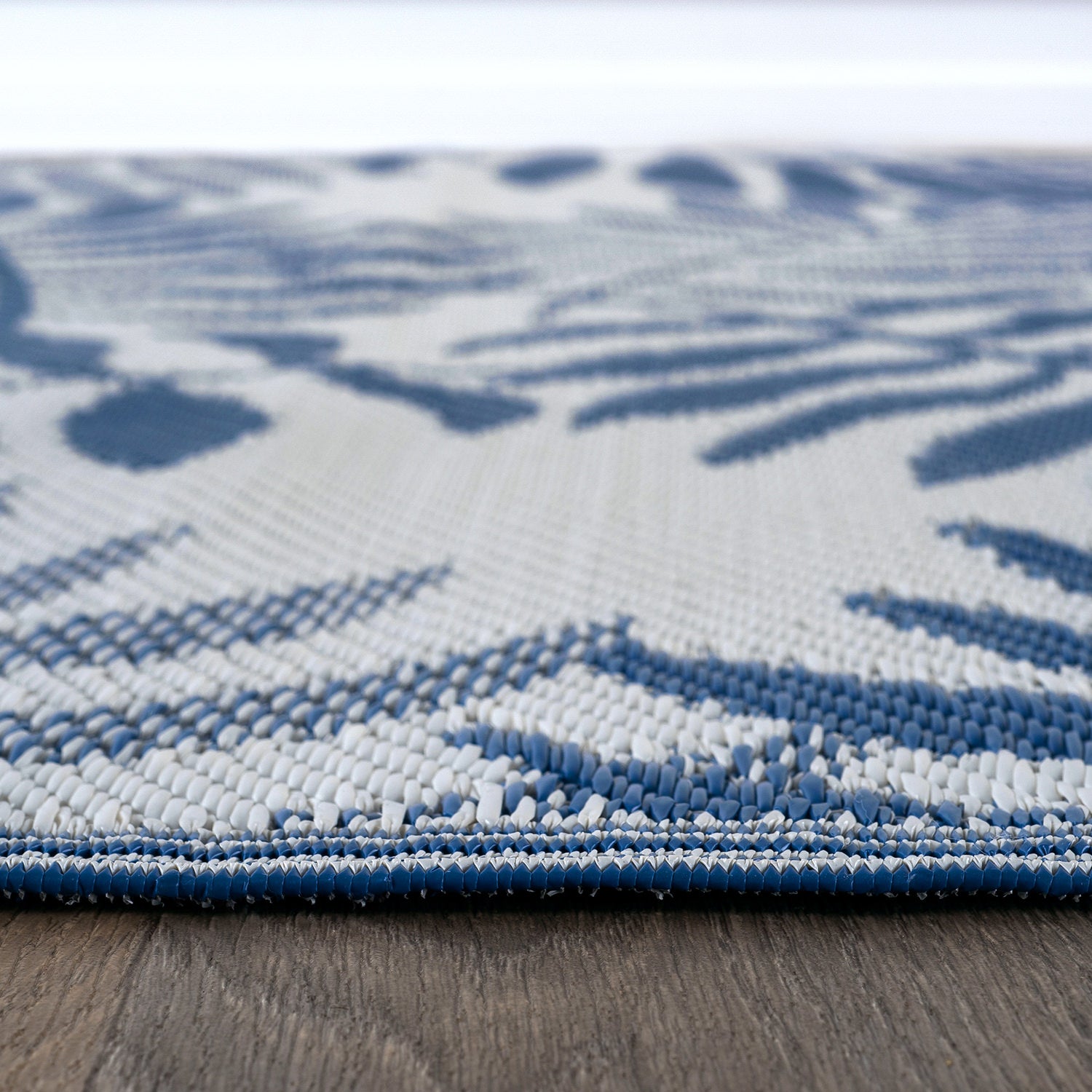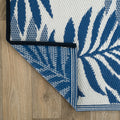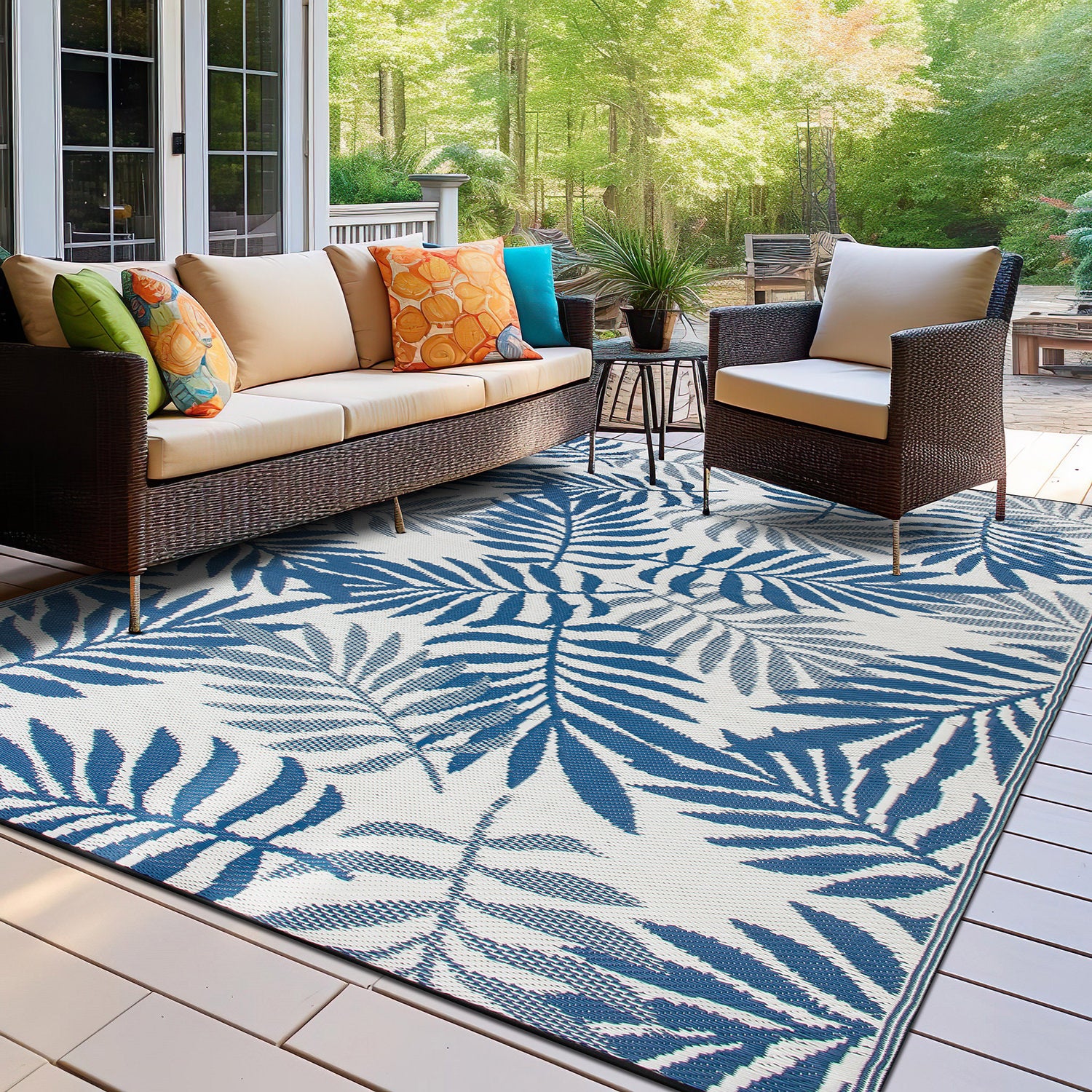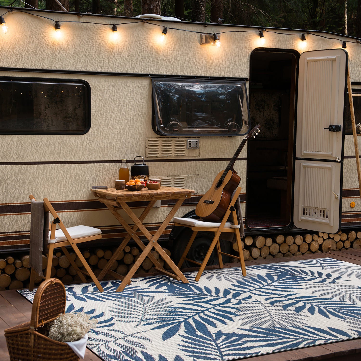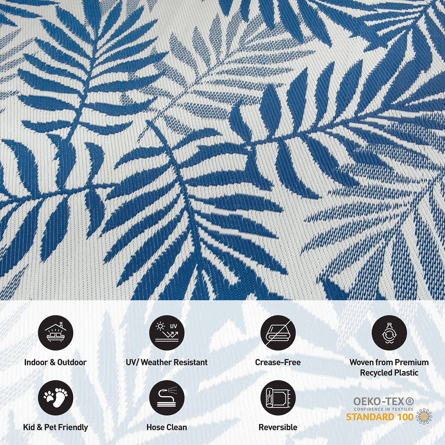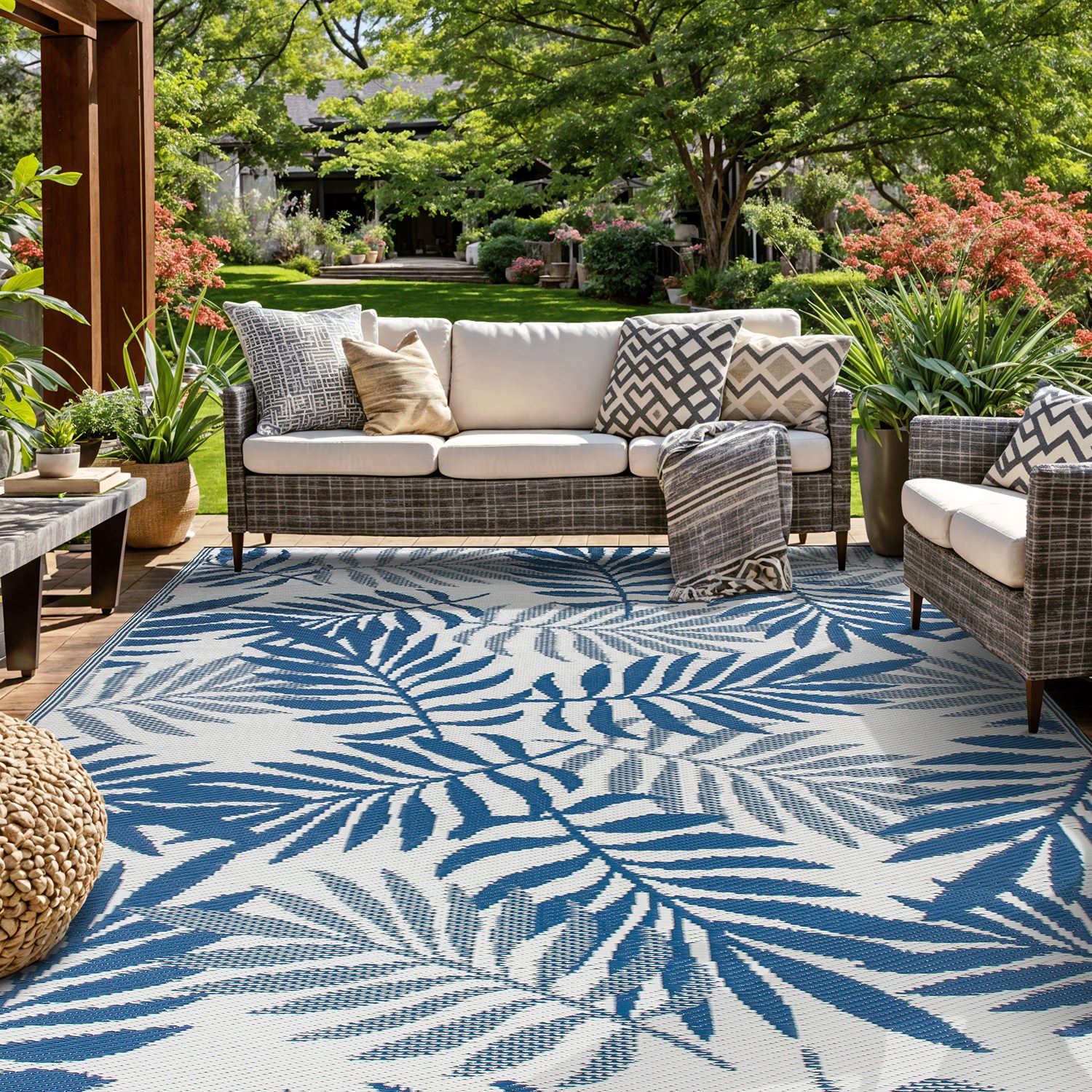 This rug is so stylish! It is perfect for patio, deck, or any outdoor setting. I love it so much! It is easy to clean and maintain! It is made from recycled plastic and it is both durable and environmentally conscious. I like that it is reversible with two distinct looks with the palm leaf pattern adding a tropical flair. The navy color is vibrant yet versatile, complementing various outdoor decors. Really well made and high quality.