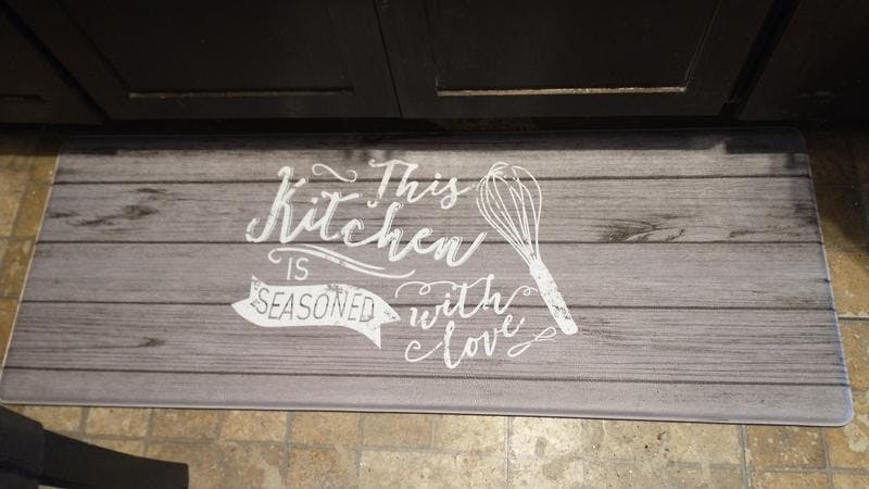 The mat has good cushion that makes it easy on the feet. It's easy to clean, you literally just wipe to clean up any mess. The design is super cute and I love the wording and style on the mat. If you purchase this mat, be aware that it is not slip resistant. I have tile floors in my kitchen and the rug occasionally slides across the floor.