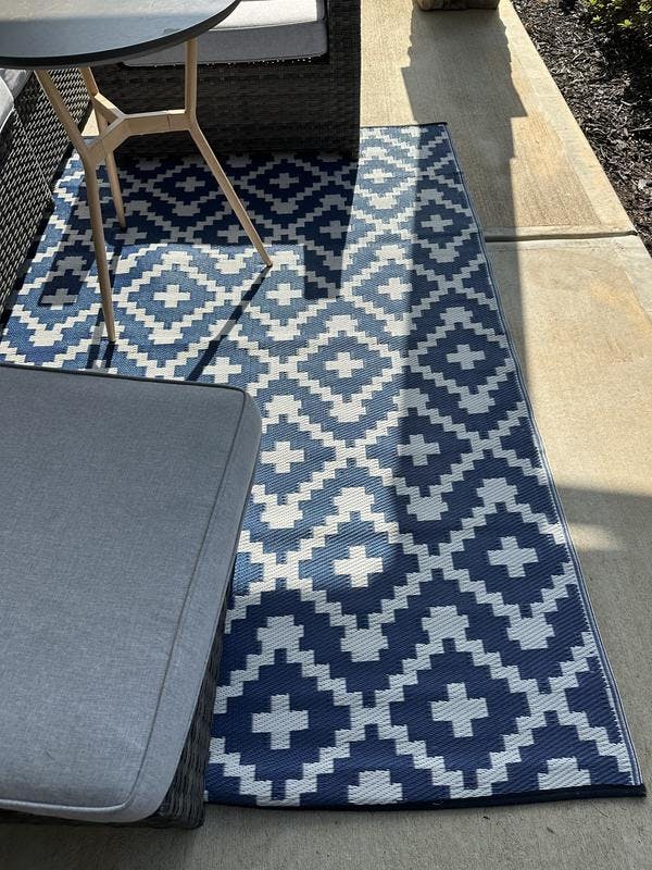 • Reversible crease-free waterproof premium recycled plastic outdoor rugs. Easy Care: These stain resistant rugs are easy to maintain. When spills and accidents occur, blot the stains, rinse with a hose, sweep or use a leaf blower to remove dirt.Rug pad recommended for indoor uses only.