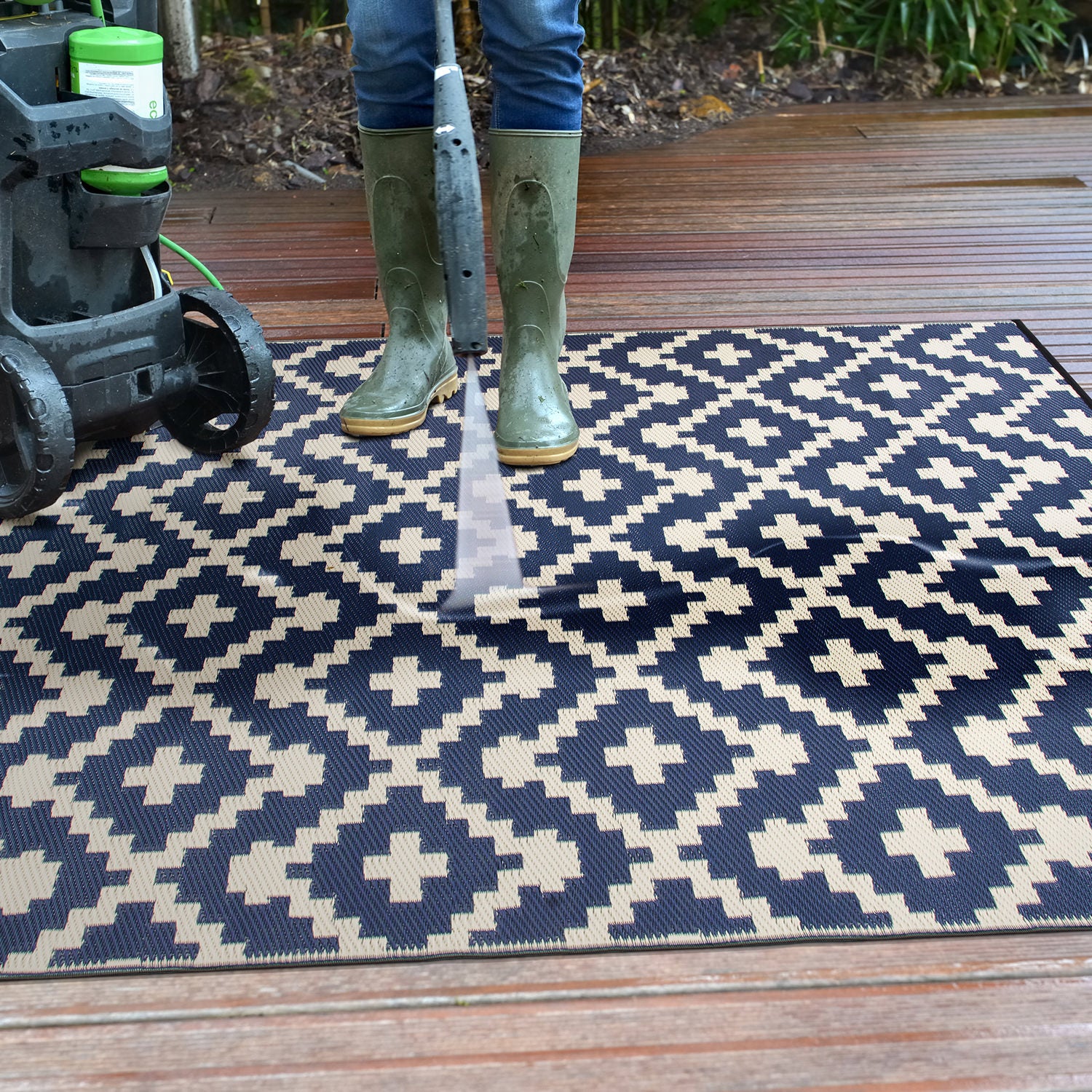 This reversible rug looks amazing and is so soft and cushioned on your feet. Both sides have a nice design. Can be flipped over back and forth to maintain the look of each side. Such a nice feeling on your barefeet that is super giving and a great addition to a hard outdoor floor, garage, playroom, or exercise room.