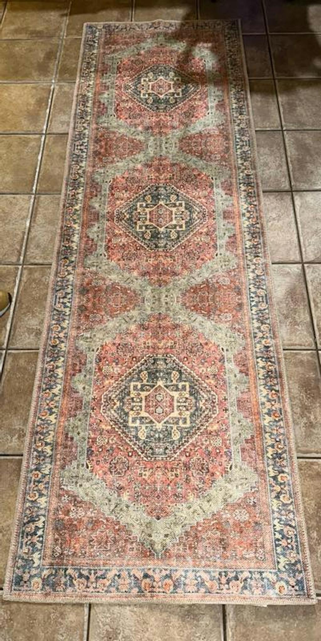 Add richness and warmth to your space with this vintage-inspired medallion rug in brick red, charcoal, and ivory. Made from OEKO-TEX® certified recycled polyester, its flat-pile surface is perfect for high-traffic areas and fits under furniture with ease. A non-slip backing and machine-washable design make it a practical yet stylish choice for everyday living. Ships folded; any creases will relax naturally within a few days.
