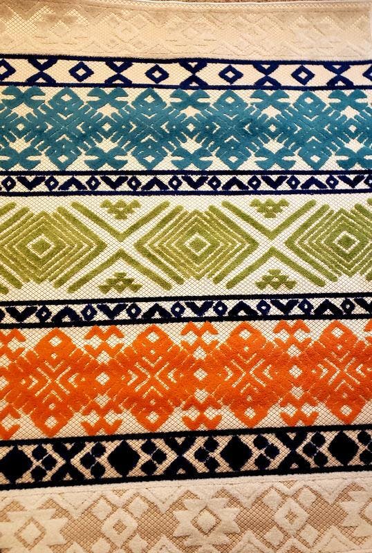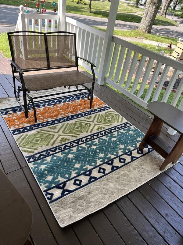 Nice rug for porch that gives a festive bohemian vibe! Nice size & quality seems good. The pattern is raised so it has some texture to it. I bought some bright chair cushions to match the colors and it looks great.