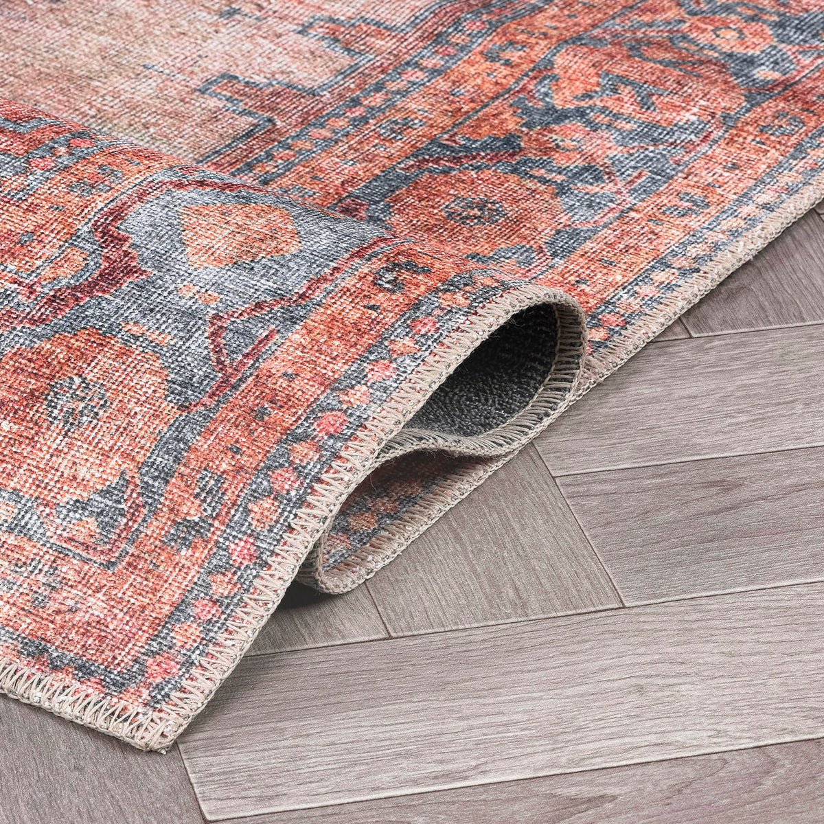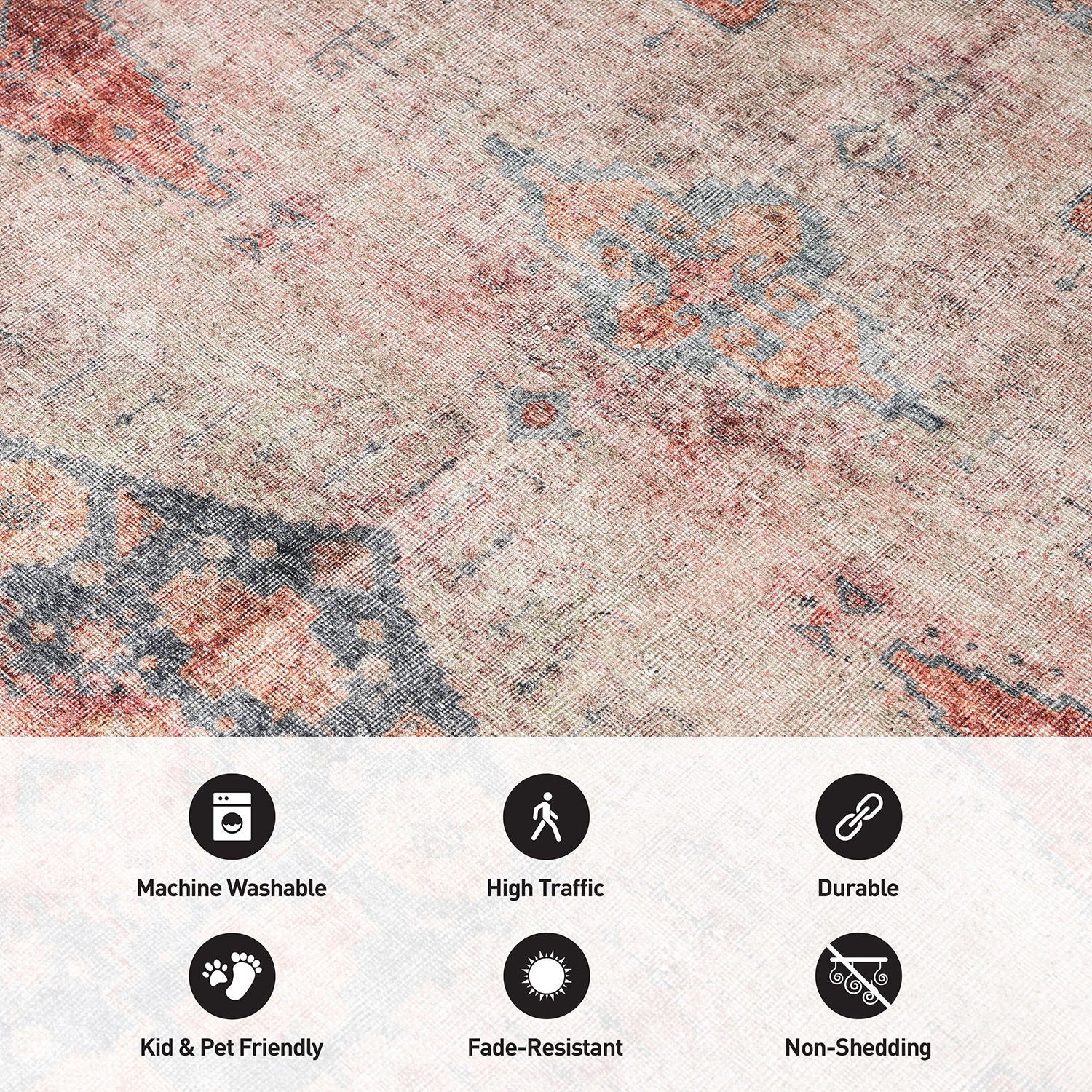 Immerse your space in the rich blend of traditional Oriental aesthetics and global-inspired motifs with our machine-washable polyester area rug. Now featuring a non-slip backing for added safety, the medallion design adds a touch of timeless elegance, while the distressed elements bring a contemporary twist. Crafted for enduring comfort and durability, this rug is ideal for high-traffic areas and pet-friendly living. The flat-woven construction ensures easy maintenance, and with OEKO-TEX certified premium recycled materials, it's a stylish and eco-conscious choice for your home.